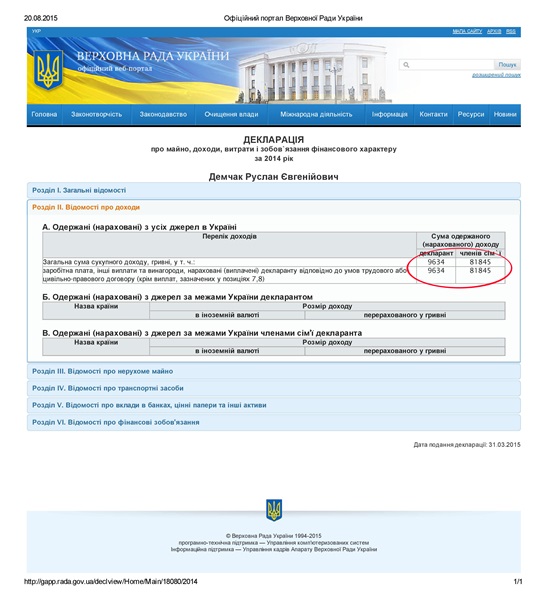 Згідно з декларацією за 2014 рік доходи його сім’ї склали трохи більше 81 тисячі гривень (3 тисячі доларів за тодішнім курсом),доходи Демчака — 9 634 гривень, що трохи більше 300 доларів.