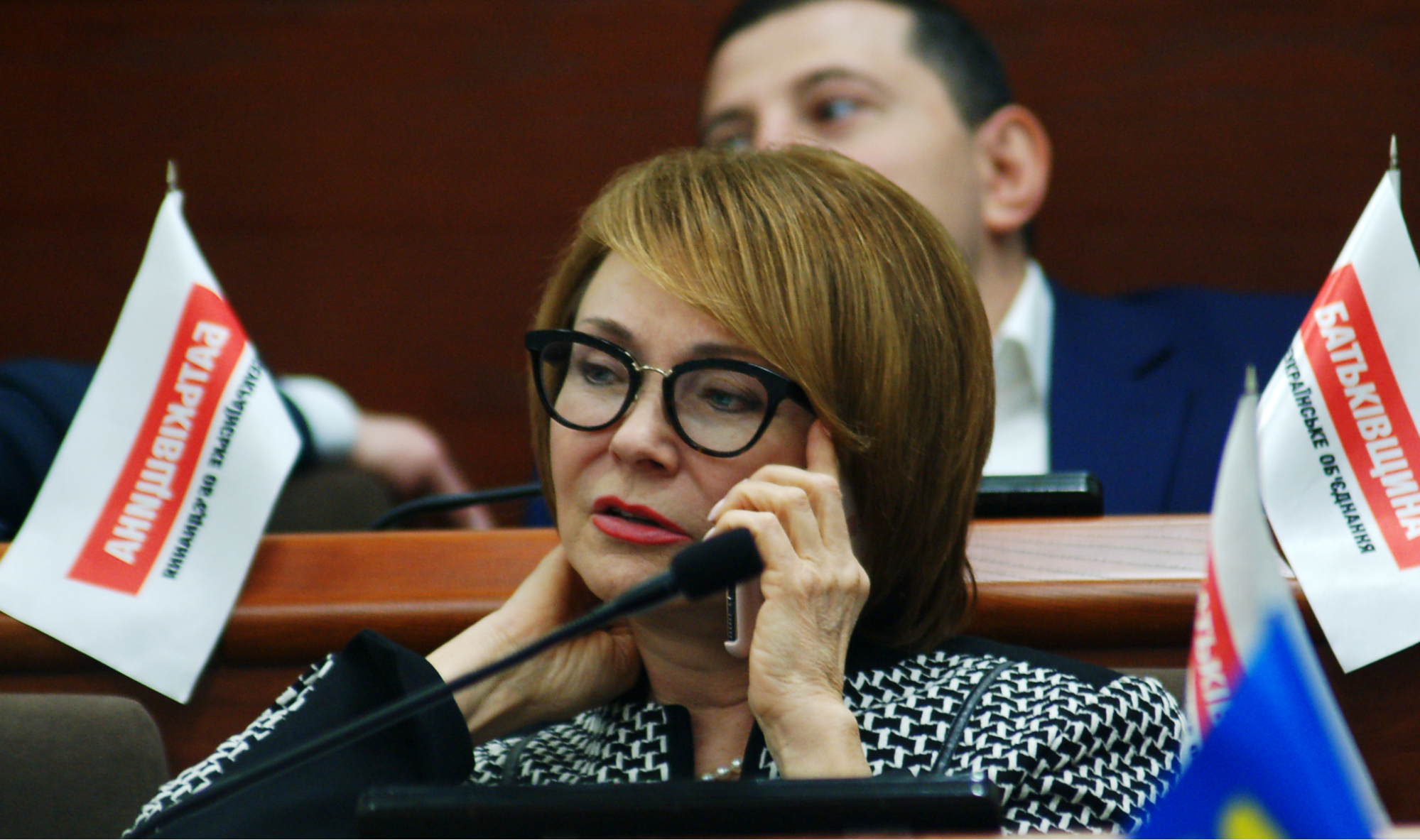 Видно, що під час телефонних розмов у Київраді депутатка ховала наліпку, прикриваючи її рукою.