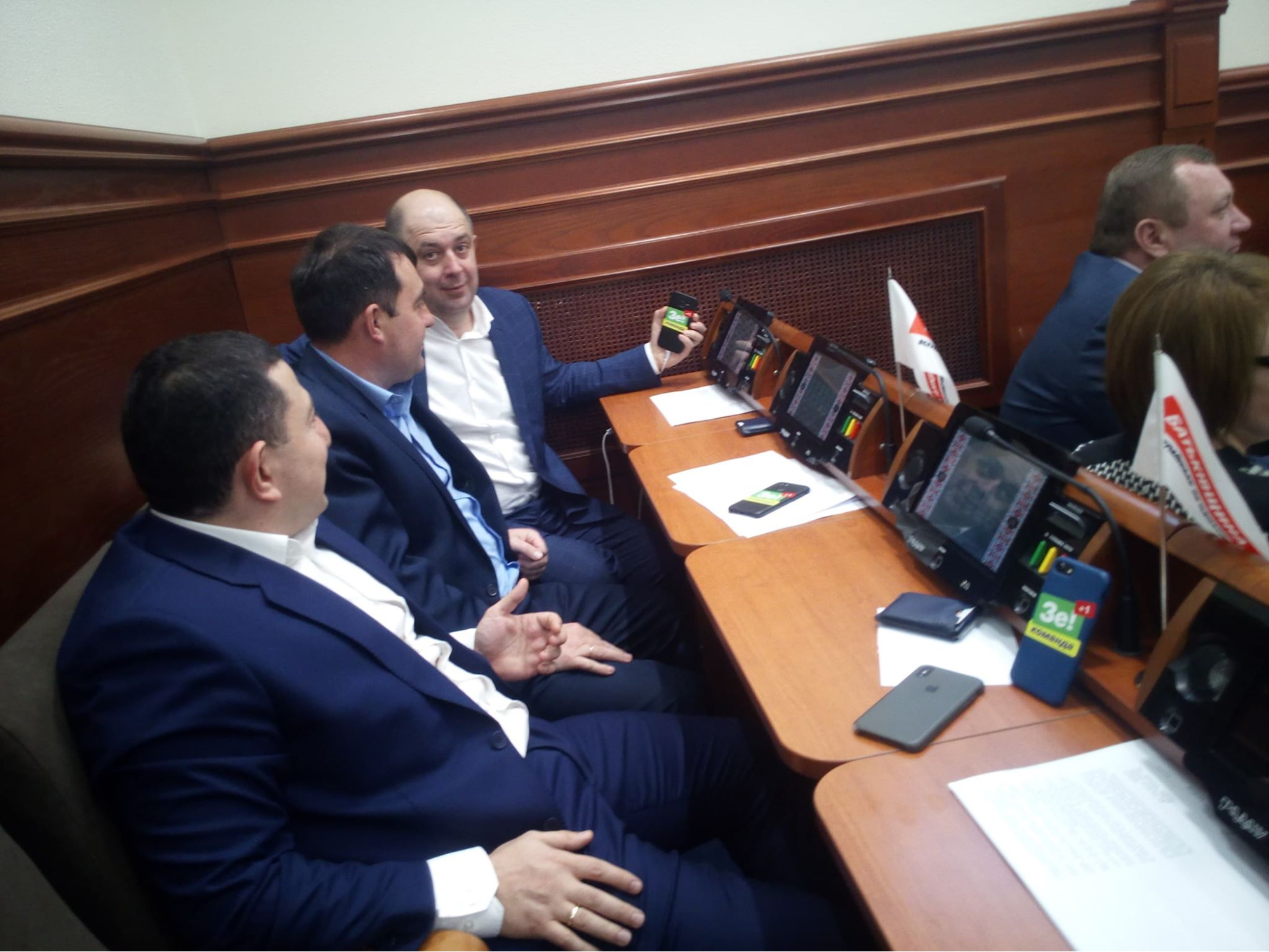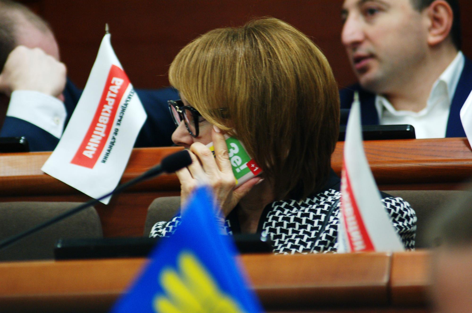 Не помітити її навіть самій Меліховій було б складно, бо депутатка поклала телефон на стіл догори наліпкою й на фото, яке вдалося зробити Руху ЧЕСНО, видно, що вона сидить на своєму місці.