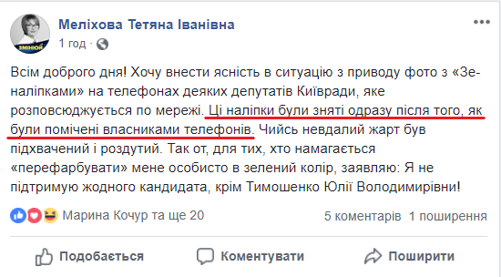 Депутатка Київради від "Батьківщини" Тетяна Меліхова, яка вранці стверджувала, що наліпка за Зеленського на її телефоні означає її особисту підтримку, невдовзі написала пост на своїй сторінці у Facebook.