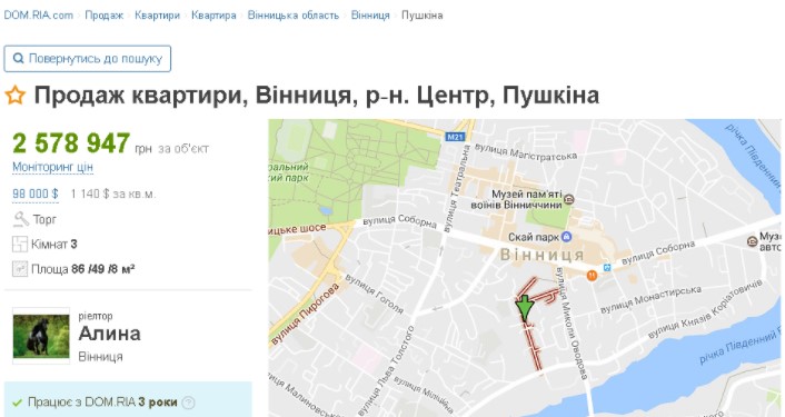 Квартири по вулиці Пушкіна зі схожою площею коштують у 25 разів більше. Про це свідчать оголошення в інтернеті.