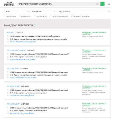 Всього мати депутата Задорожнюка, згідно з даними Youcontrol, має відношення до 7 фірм.