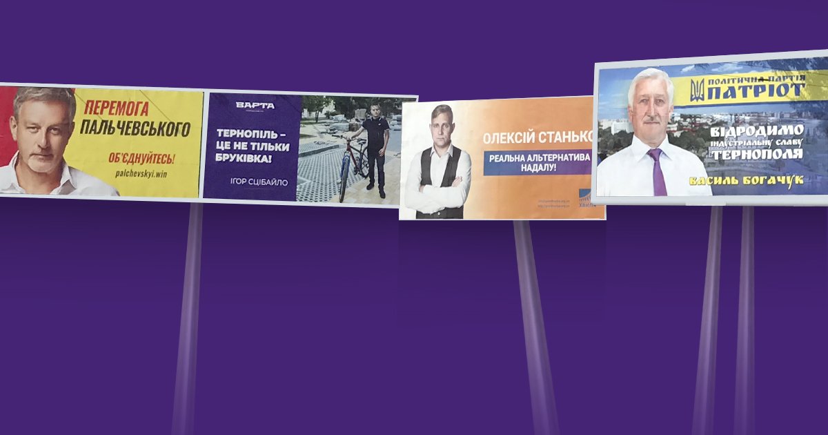 Дочасна агітація в Тернополі почала з’являтися ще в липні цього року, і вона не містила вихідних даних. Станом на серпень Рух ЧЕСНО зафіксував у місті зовнішню рекламу щонайменше 14 партій.
