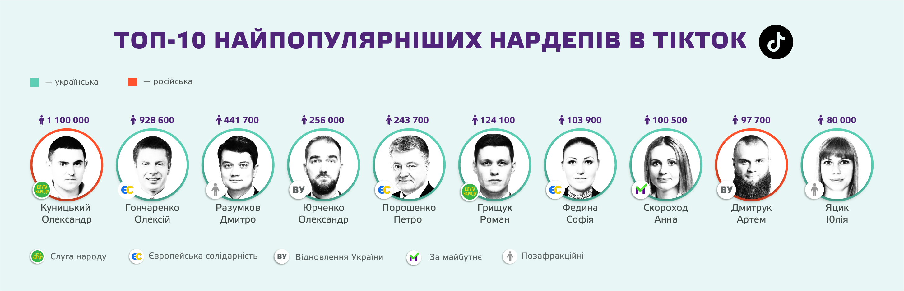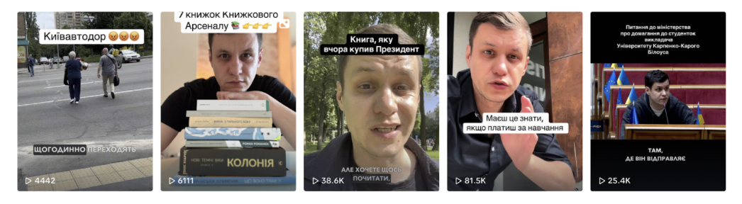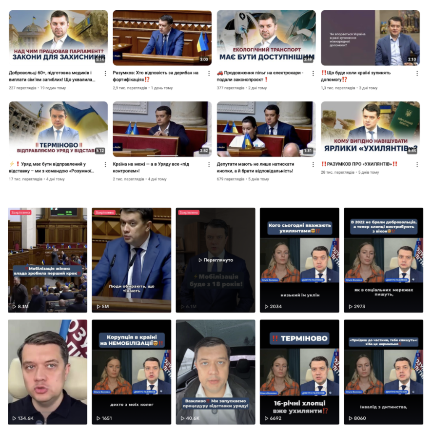 Ще один яскравий приклад — ексголова ВРУ, перший номер списку “Слуги народу”, а наразі позафракційний лідер Міжфракційного депутатського об'єднання “Розумна політика” Дмитро Разумков. На своїй сторінці він регулярно публікує уривки з виступів у Раді, деякі з них збирають понад 5 мільйонів переглядів. Подібний контент він поширює й на інших платформах, не менш активних за TikTok.