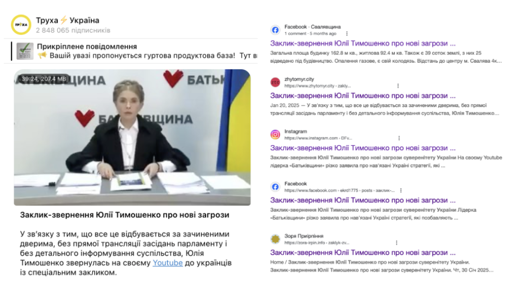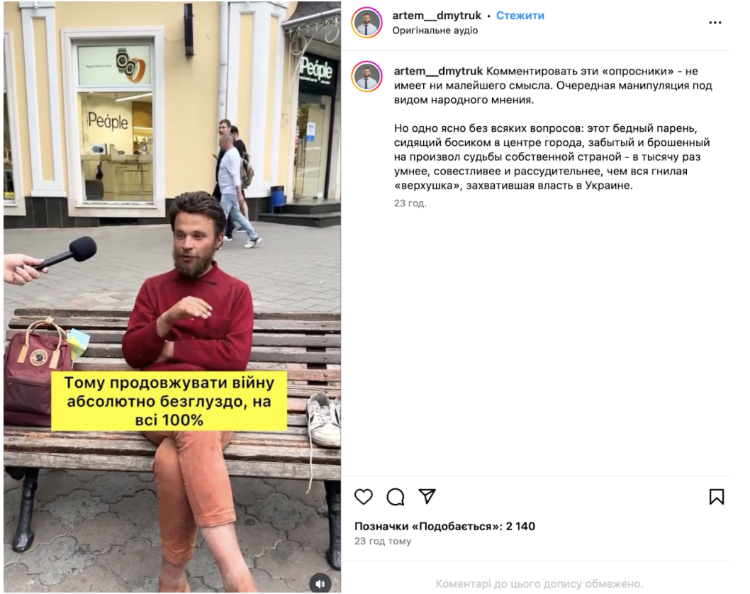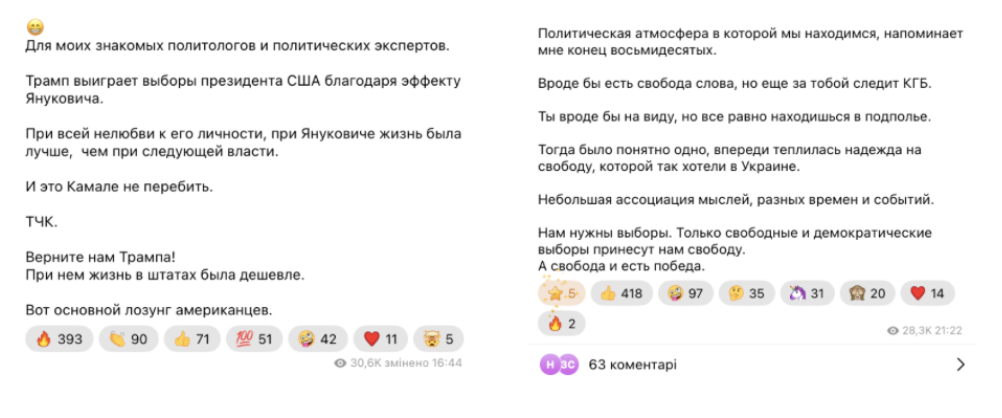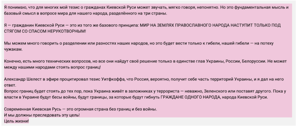 Інші популярні російськомовні Telegram-канали ведуть колишні представники більшості, а наразі депутати від групи “Відновлення України” — підсанкційний нардеп-втікач Артем Дмитрук і Євгеній Шевченко. Крім уже відомих наративів, Дмитрук додає ідеї про свою приналежність до “громадян Київської Русі” та виступає за відсутність кордонів між трьома народами — Росією, Україною та Білоруссю. Один такий допис може мати охоплення в понад 60 тисяч.