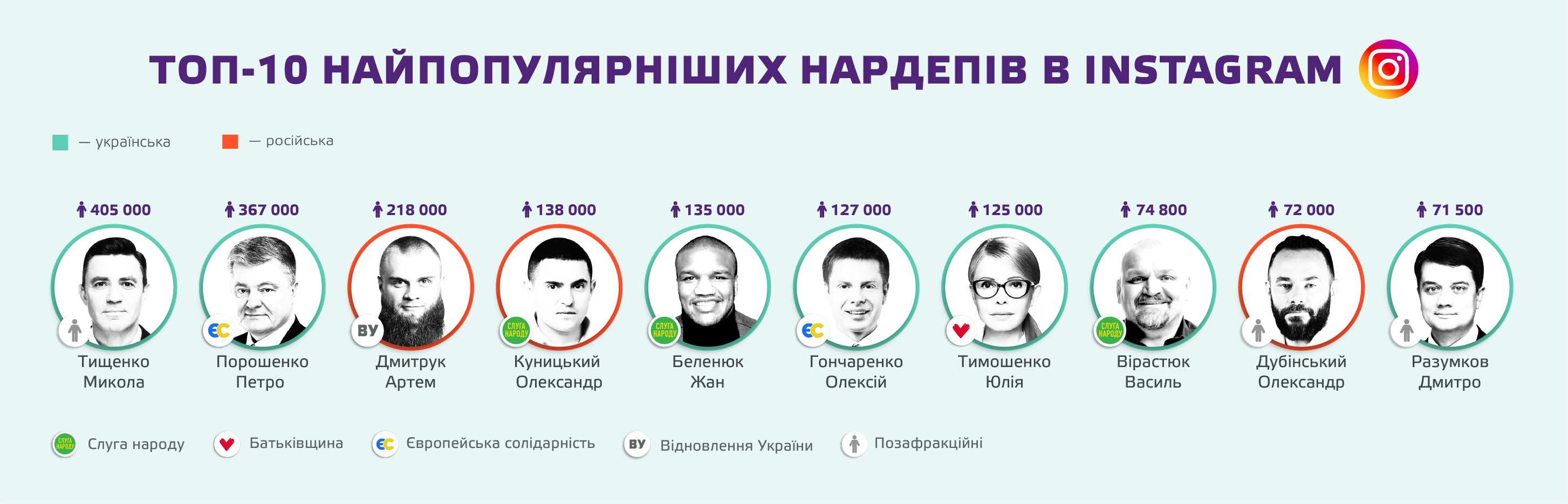 До десятки найпопулярніших нардепів в Instagram увійшли два представники зі “Слуги народу” — Жан Беленюк та Василь Вірастюк. На їхніх сторінках майже нема типового для нардепів контенту, водночас дописи орієнтовані саме на їхню діяльність як спортсменів.