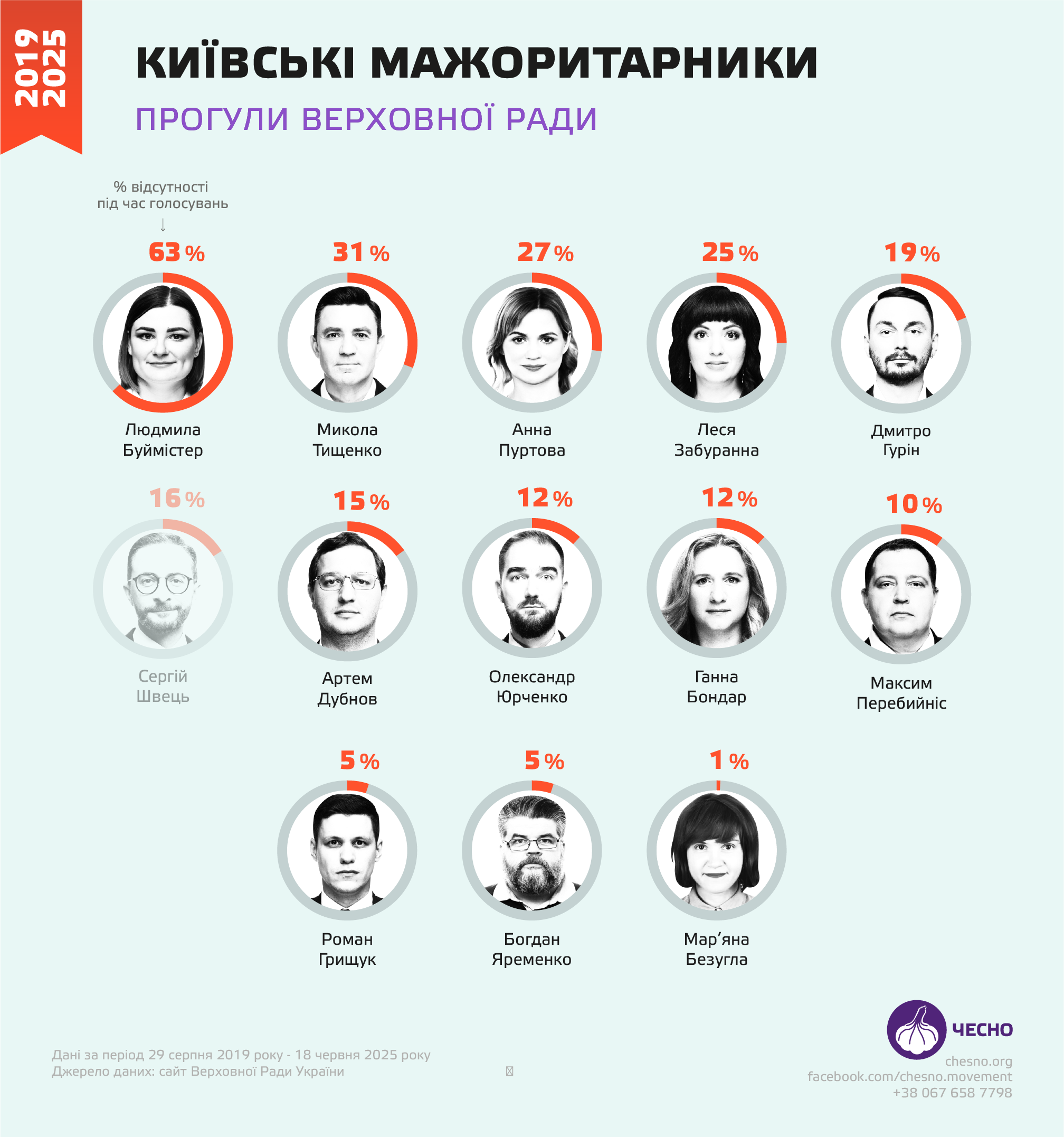 Водночас троє київських мажоритарників демонструють зразкову відвідуваність засідань Верховної Ради. Так менше 5% “прогулів” мають Роман Грищук та Богдан Яременко, а депутатка Мар’яна Безугла пропустила всього 1% голосувань.