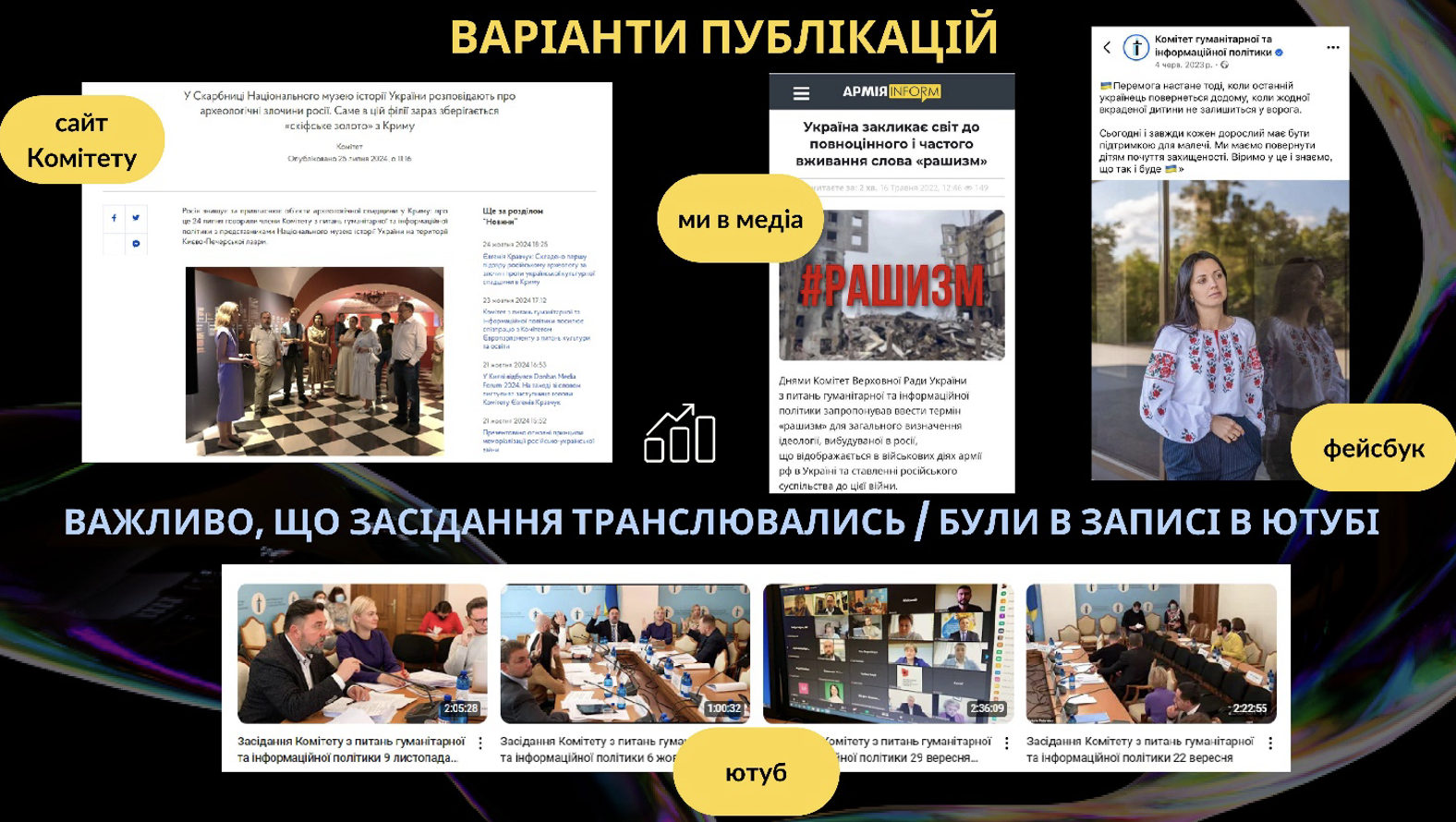 У Комітеті з питань гуманітарної та інформаційної політики ми акцентуємо на якості, доступності та змістовності, тому намагаємось публікувати новини, що передають не лише перелік розглянутих чи ухвалених проєктів, а й суть документів, доповнюємо матеріали цитатами парламентаріїв, позиціями учасників обговорень.
