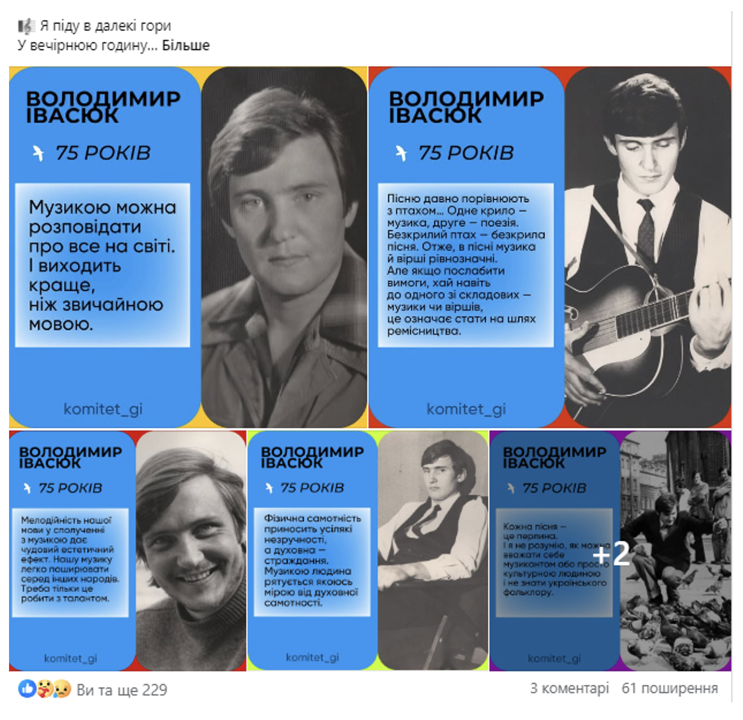 Національна памʼять: постаті української культури, науки, історії, герої сьогодення — це теж частина нашої комунікації. Це форма вшанування, яку Комітет системно підтримує. Такі дописи формують сенс, зв’язок поколінь і спільну відповідальність за памʼять. Нехай 20 / 80 чи 30 / 70 відсотків, але усе це має бути висвітлено, адже ти проживаєш історичні події разом із усіма українцями і відчуваєш, що потрібно сказати зараз.