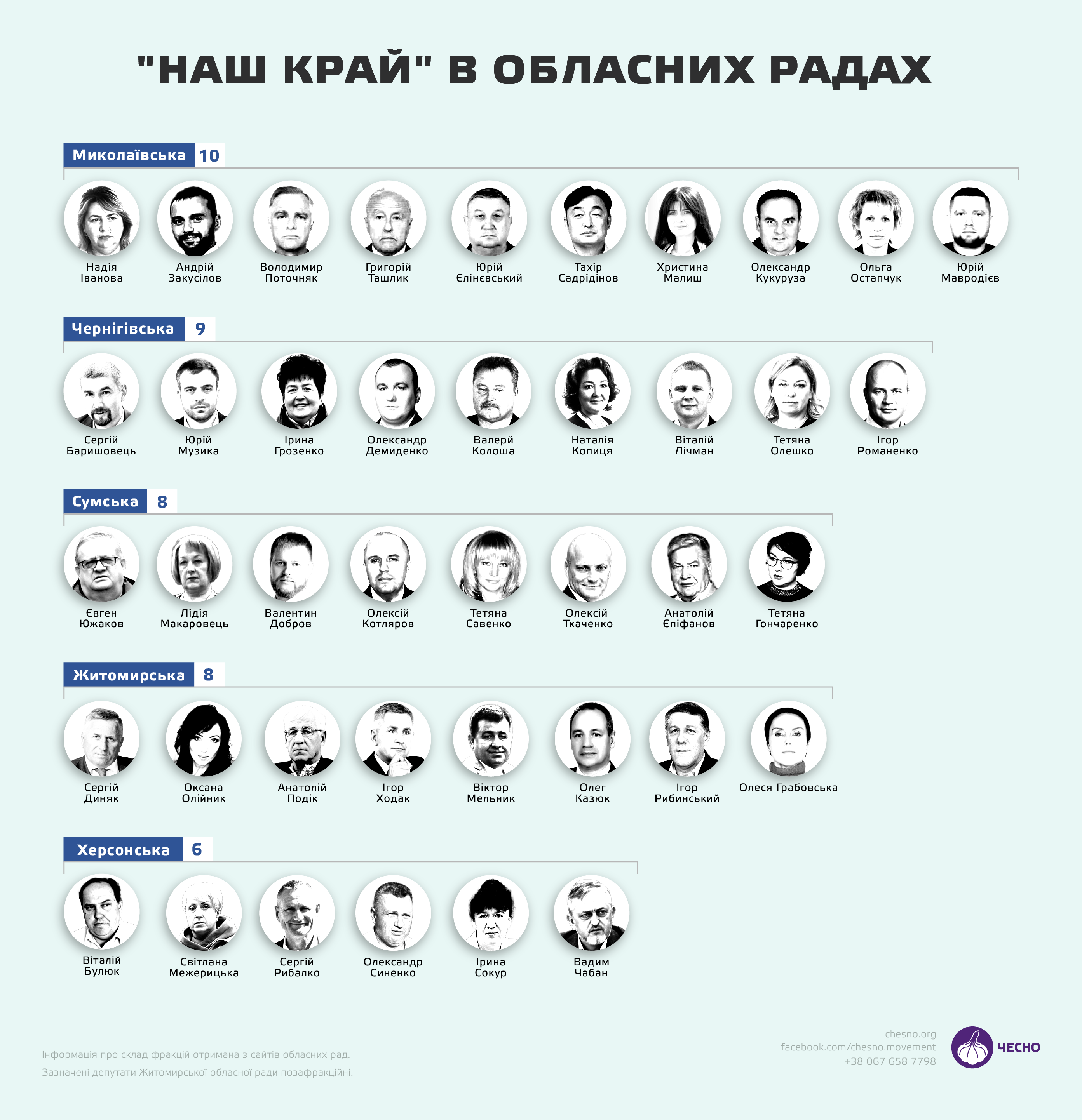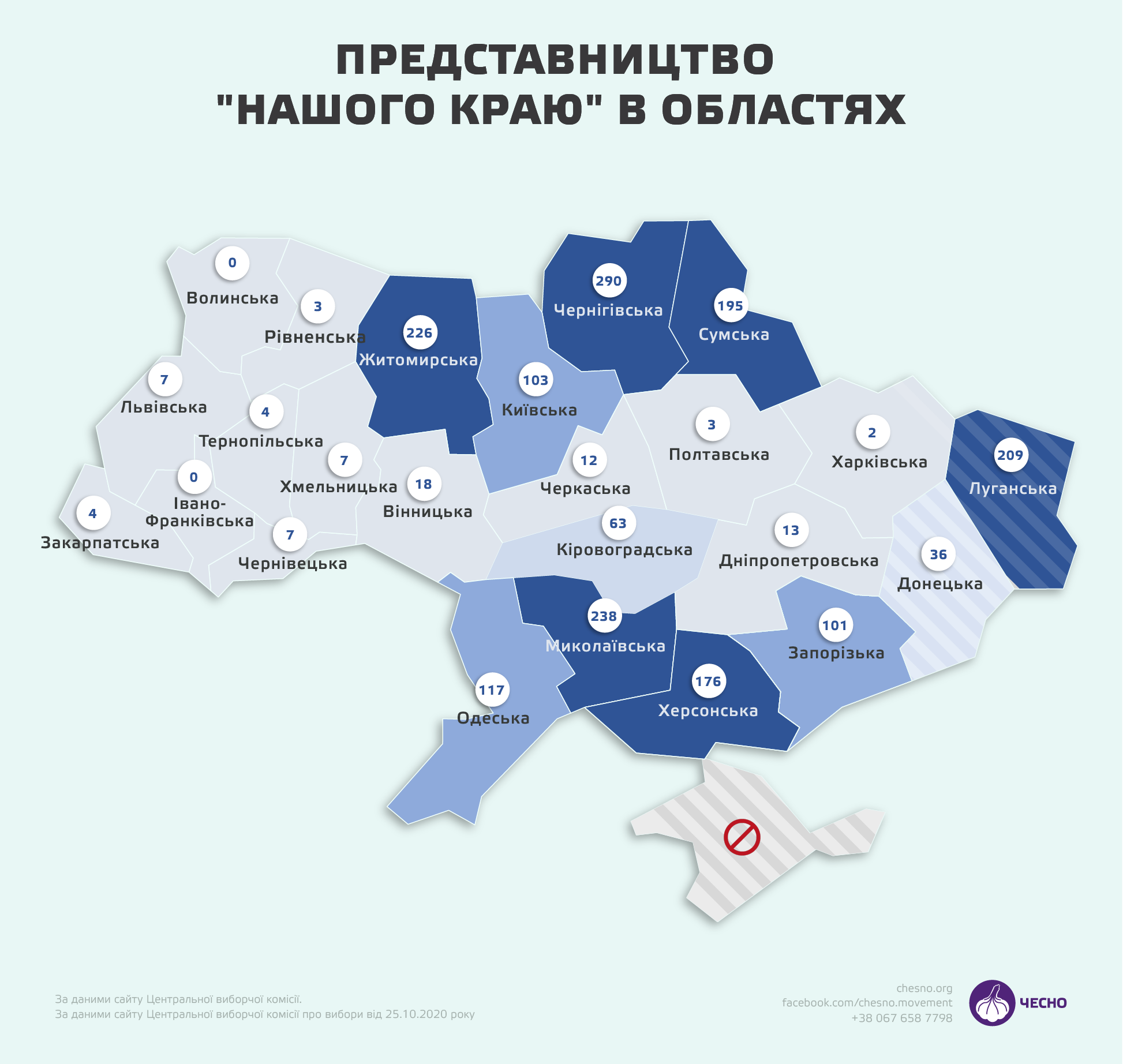 Найвищий рівень підтримки був у “Нашого краю” в Житомирській, Луганській, Миколаївській, Сумській, Херсонській і Чернігівській областях. Приміром, в останній партійці отримали 290 мандатів.