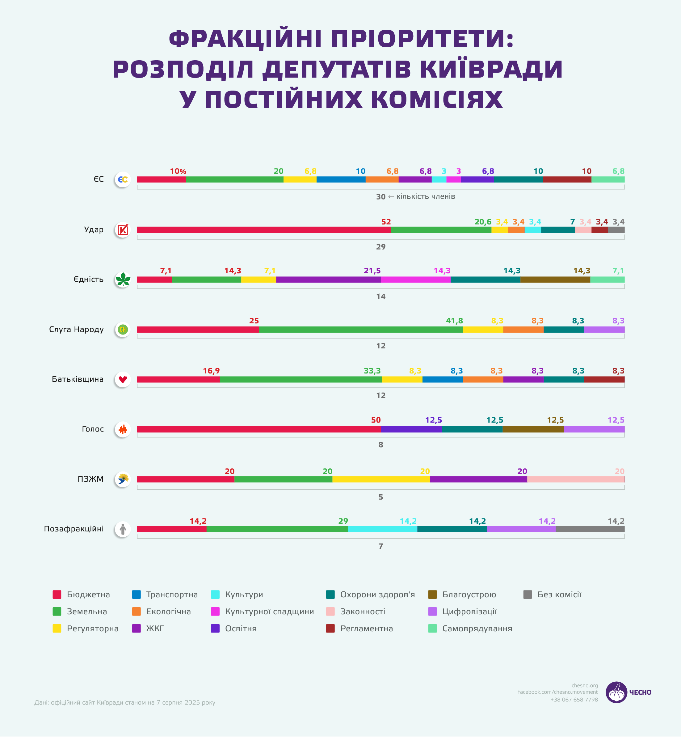 Частина фракцій зробила значний акцент на земельній та бюджетній комісіях — 33% “Батьківщини” займаються питаннями архітектури та містопланування, а серед “Слуг народу” ця часткаа складає майже 42%. Половину свого складу УДАР, як зазначалося раніше, розподілив до комісії з питань бюджету.