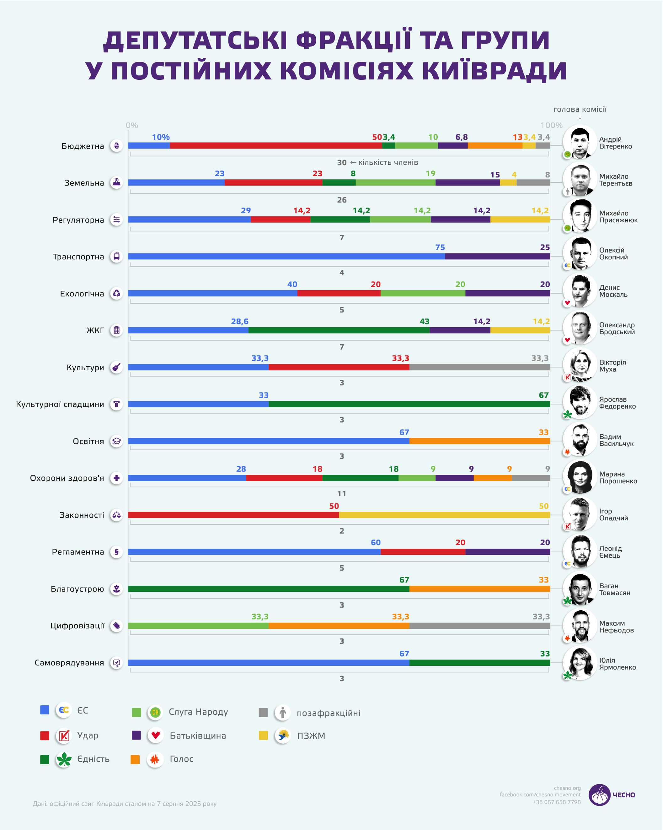 Комісія з питань бюджету сьогодні налічує 30 депутатів, половина з них — представники партії Кличка. Комісія займається ухваленням обсягу та розподілом столичних грошей, тож усі очікувано зацікавлені в членстві. Зазначимо, що бюджетна комісія — єдина з 15-ти, де присутні члени з усіх депутатських фракцій та груп.