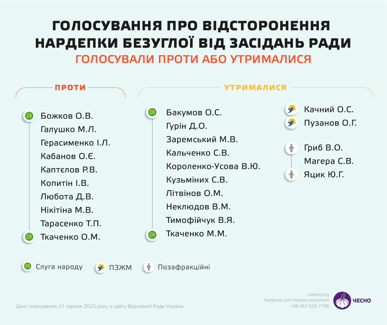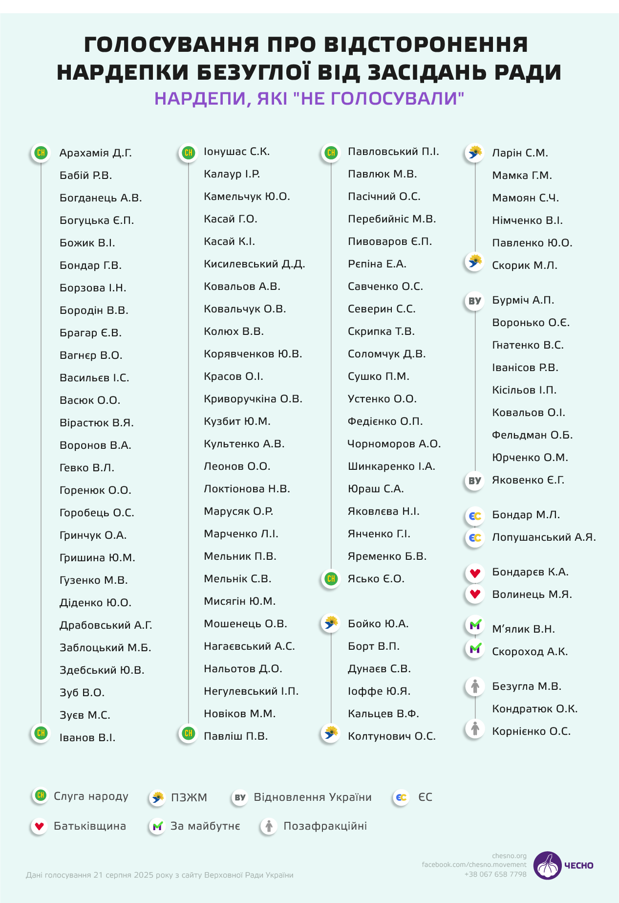 За таке рішення Безугла має завдячувати передусім колишнім однопартійцям зі “Слуги народу” (119 з них або 52% фракції так чи інакше ухилились від участі в голосуванні), а також нардепам з груп “Довіра”, ПЗЖМ та “Відновлення України”, в яких 70% депутатів “випарувались” під час цього голосування.
