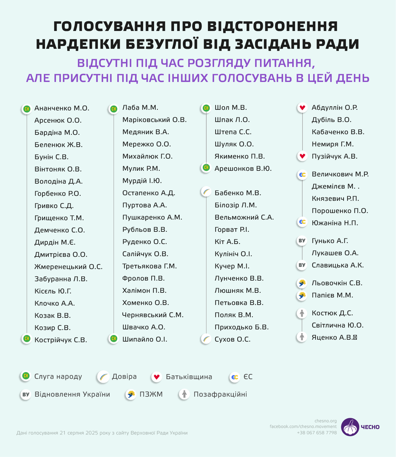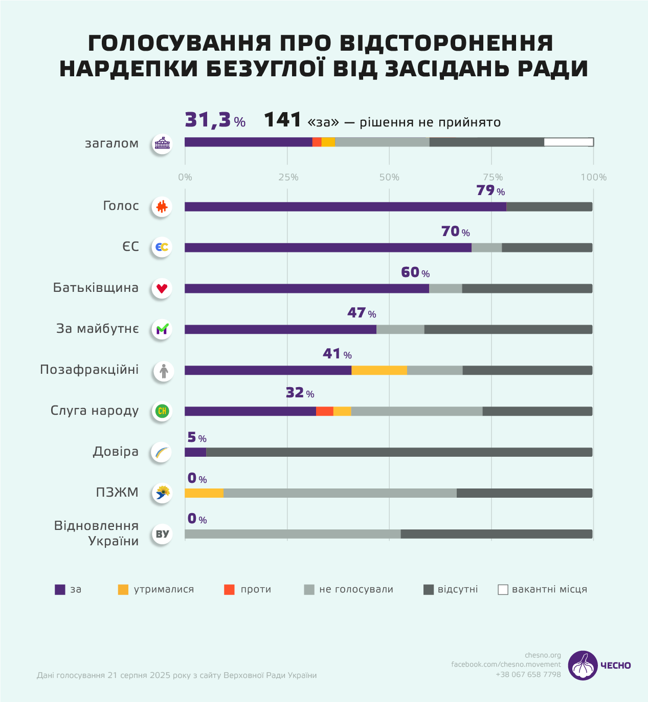 Власне, тут видно найбільший розрив: лише третина “слуг” (74 депутати) підтримали відсторонення, тоді як більшість (52%) просто не натиснули жодну кнопку, чим фактично зірвали ухвалення рішення.