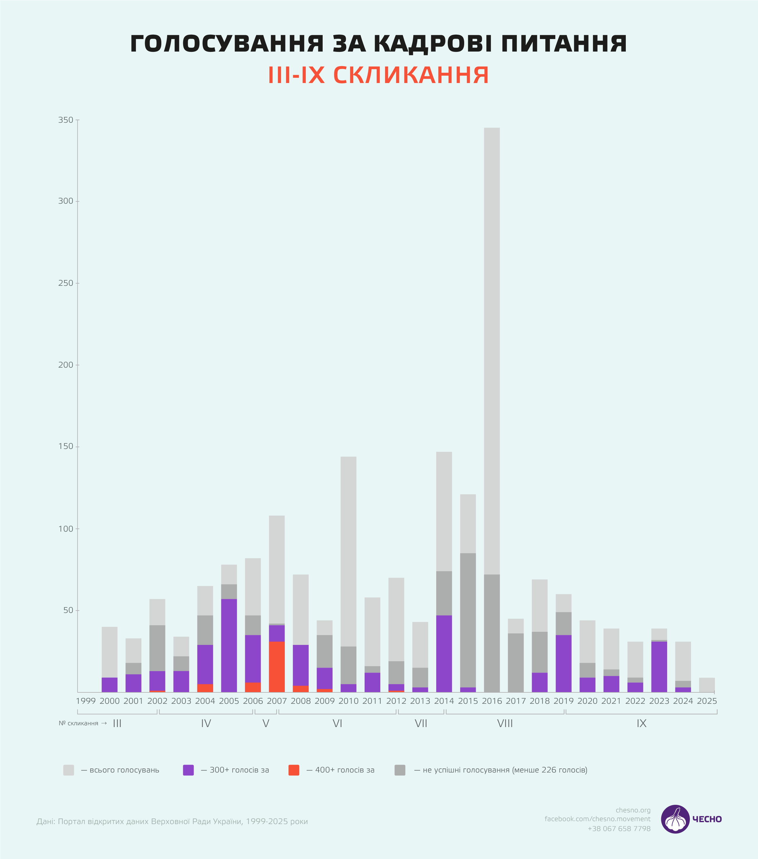 З 1999 року і до сьогодні Верховна Рада ухвалила понад 36 тисяч рішень, частина з них — це кадрові питання про призначення й звільнення міністрів, голів держпідприємств і керівників ключових органів влади. З понад 1900 кадрових рішень, розглянутих у Раді впродовж ІІІ-ІХ скликань, 468 були проголосовані конституційною більшістю — тобто понад 300 голосами “за”.