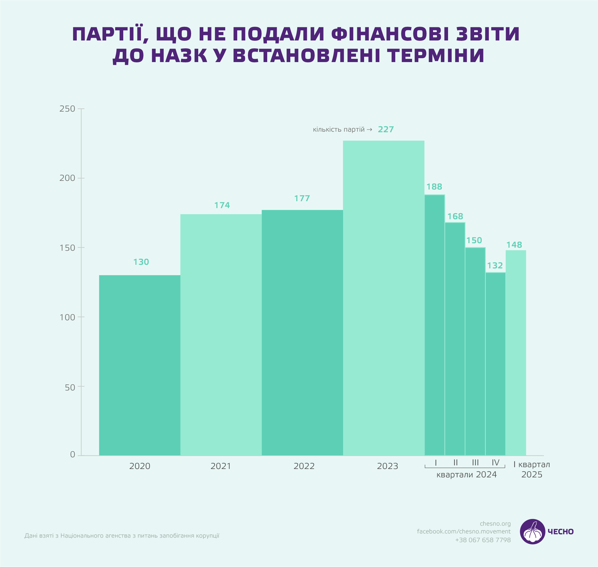 Однак є низка політичних сил, які ігнорують законодавчі правила. Так НАЗК оприлюднює список партій, які не подали звіти вчасно, протягом 10 днів після завершення дедлайну подачі фінансової звітності. Лише за перший квартал 2025 року до цього списку увійшли 148 партій.