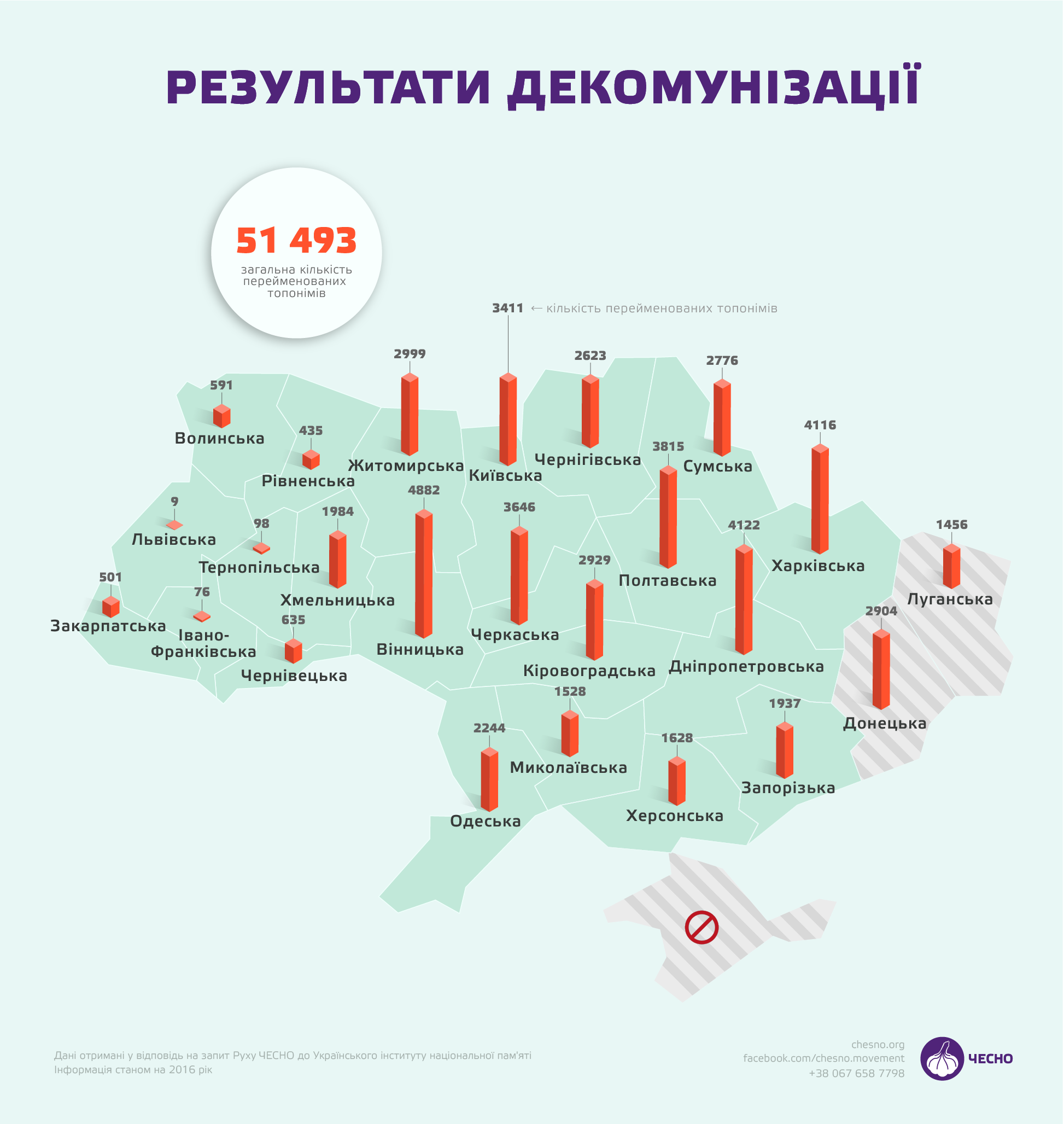 А завдяки попередньому закону про декомунізацію знесли 2389 пам’ятників і пам’ятних знаків радянським діячам, а також змінили назви понад 50 тисяч топонімів.