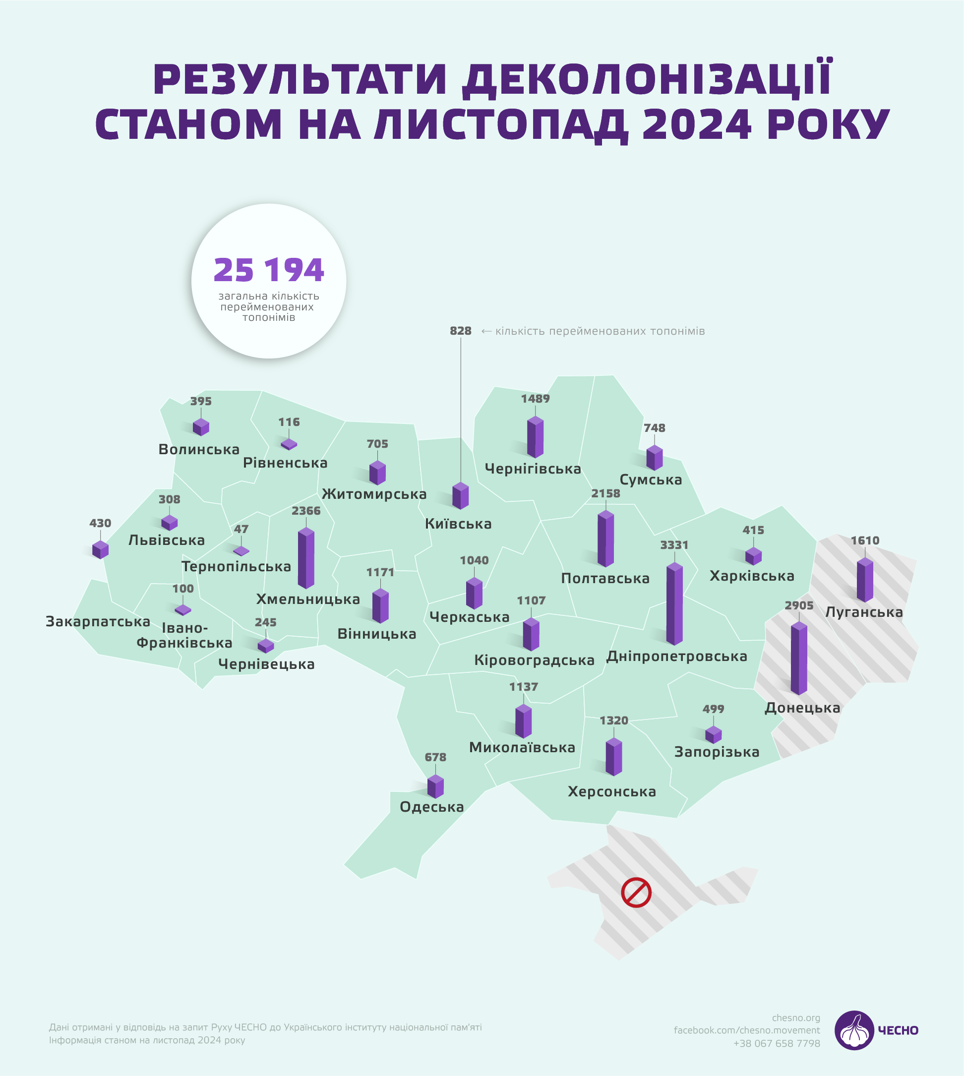 Трохи більше двох років тому набув чинності закон про деколонізацію. За даними Українського інституту національної пам’яті, станом на листопад 2024-го з мапи України зникли понад 25 тисяч російських топонімів, більш ніж тисяча пам’ятників, що підпадають під закон, демонтували. Про це йдеться в аналізі ЧЕСНО.