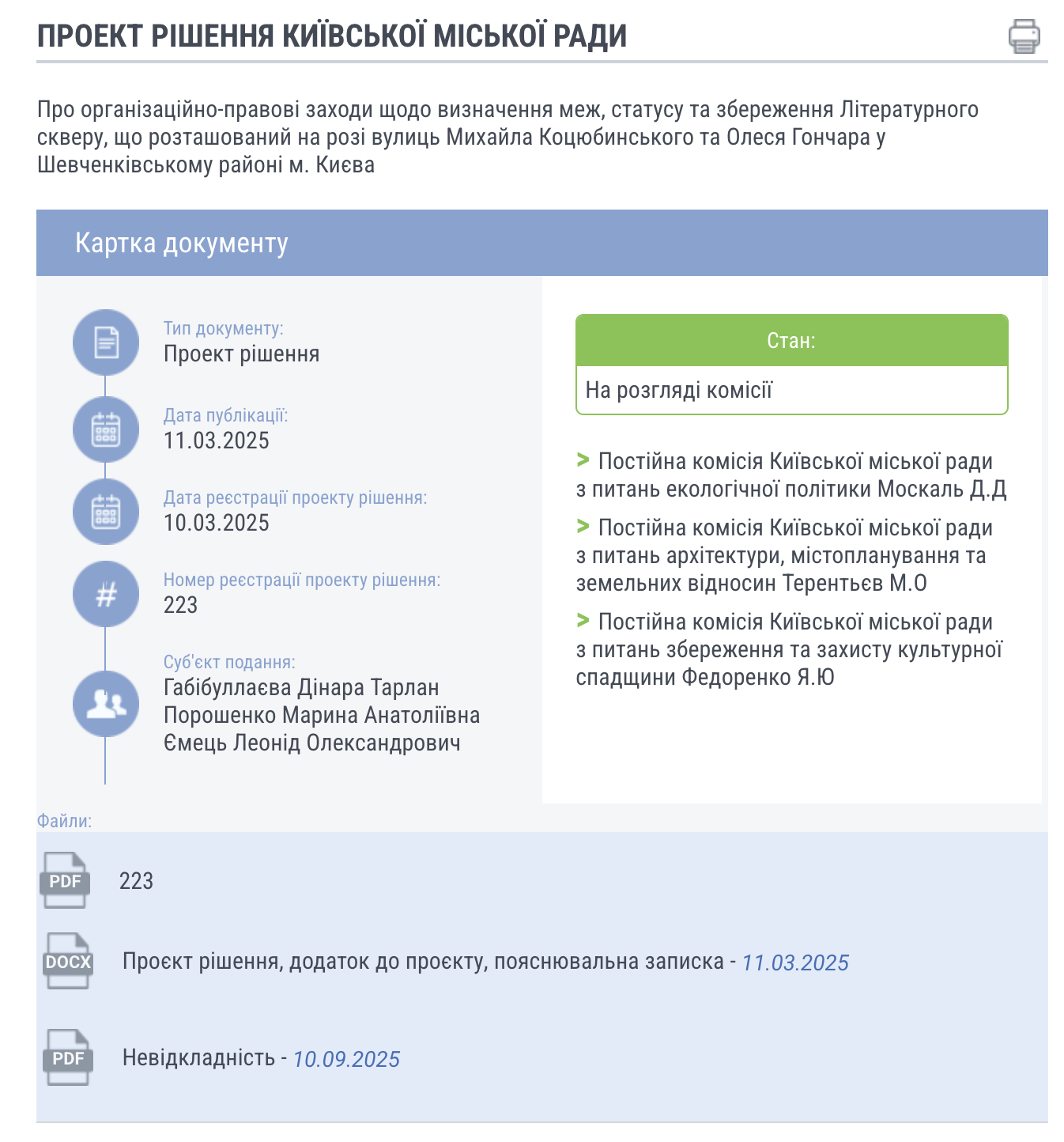 У березні на сайті Київради з’явився проєкт рішення, який стосується організаційно-правових заходів щодо визначення меж, статусу та збереження Літературного скверу. Наразі він перебуває в профільних комісіях, проте, за словами депутатки, його досі не розглянули, що може свідчити про кулуарні домовленості.