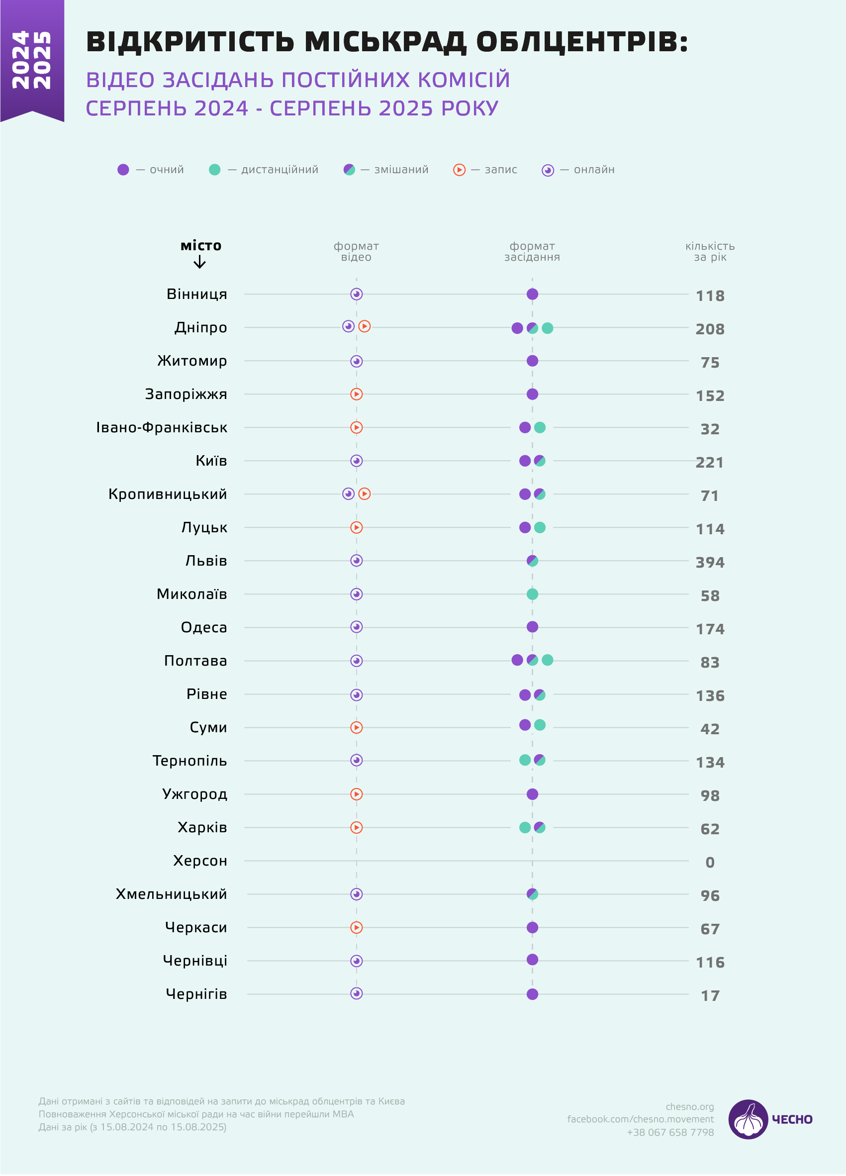 Лідерами прозорості стали Вінниця, Одеса, Житомир, Чернівці та Чернігів — саме ці міста забезпечували офлайн-роботу комісій із прямою трансляцією. Натомість обласні центри на заході країни — Львів, Тернопіль, Івано-Франківськ, Луцьк і Хмельницький — віддали перевагу змішаному формату. Деякі з них навіть додатково публікують записи, створюючи “подвійну броню”.