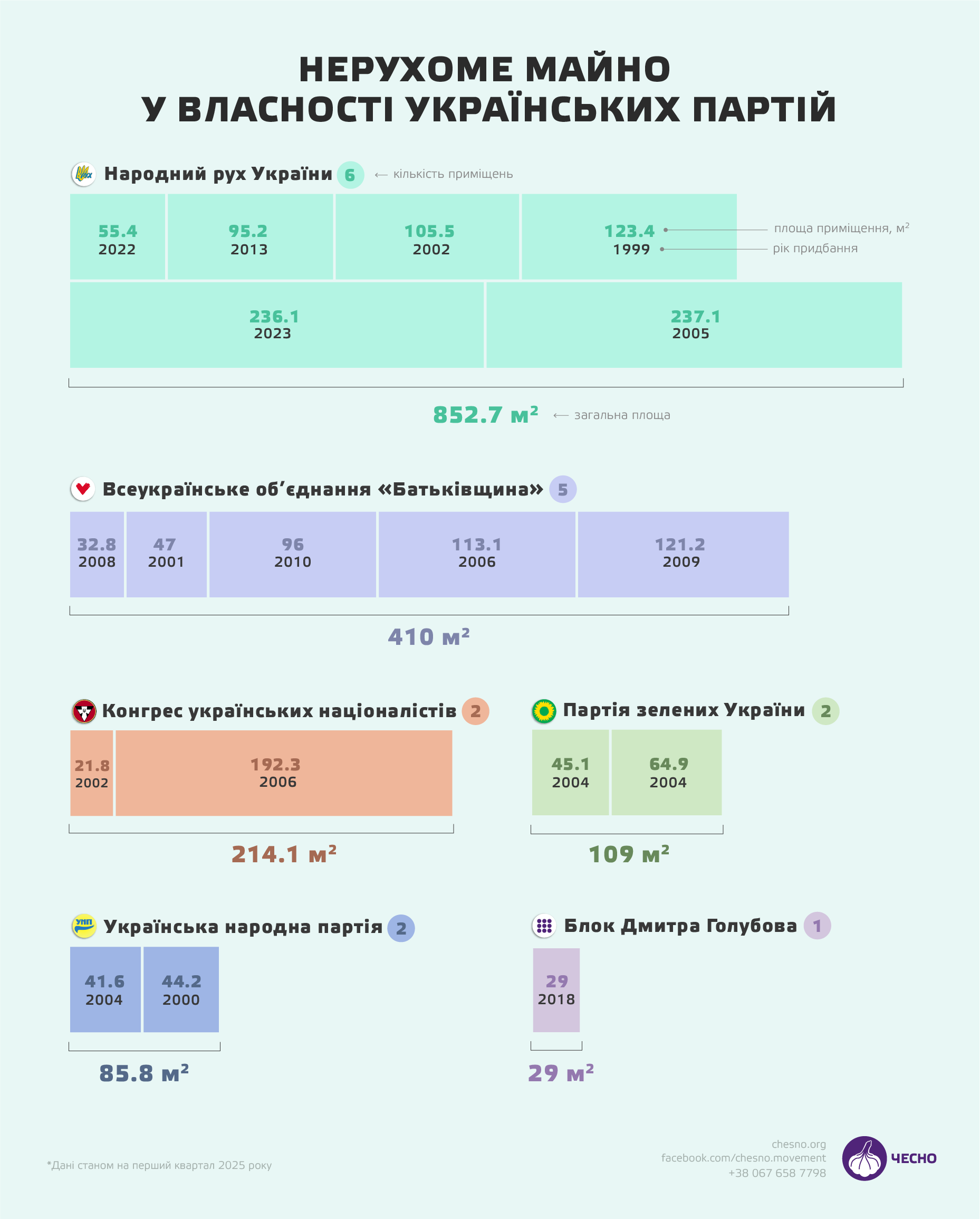 Лідером за кількістю та вартістю нерухомості став “Народний рух України”, який має шість приміщень площею понад 850 квадратних метрів і вартістю майже 12,5 мільйонів гривень. Для порівняння: сукупна вартість майна всіх інших партій лише трохи перевищує півтора мільйона.