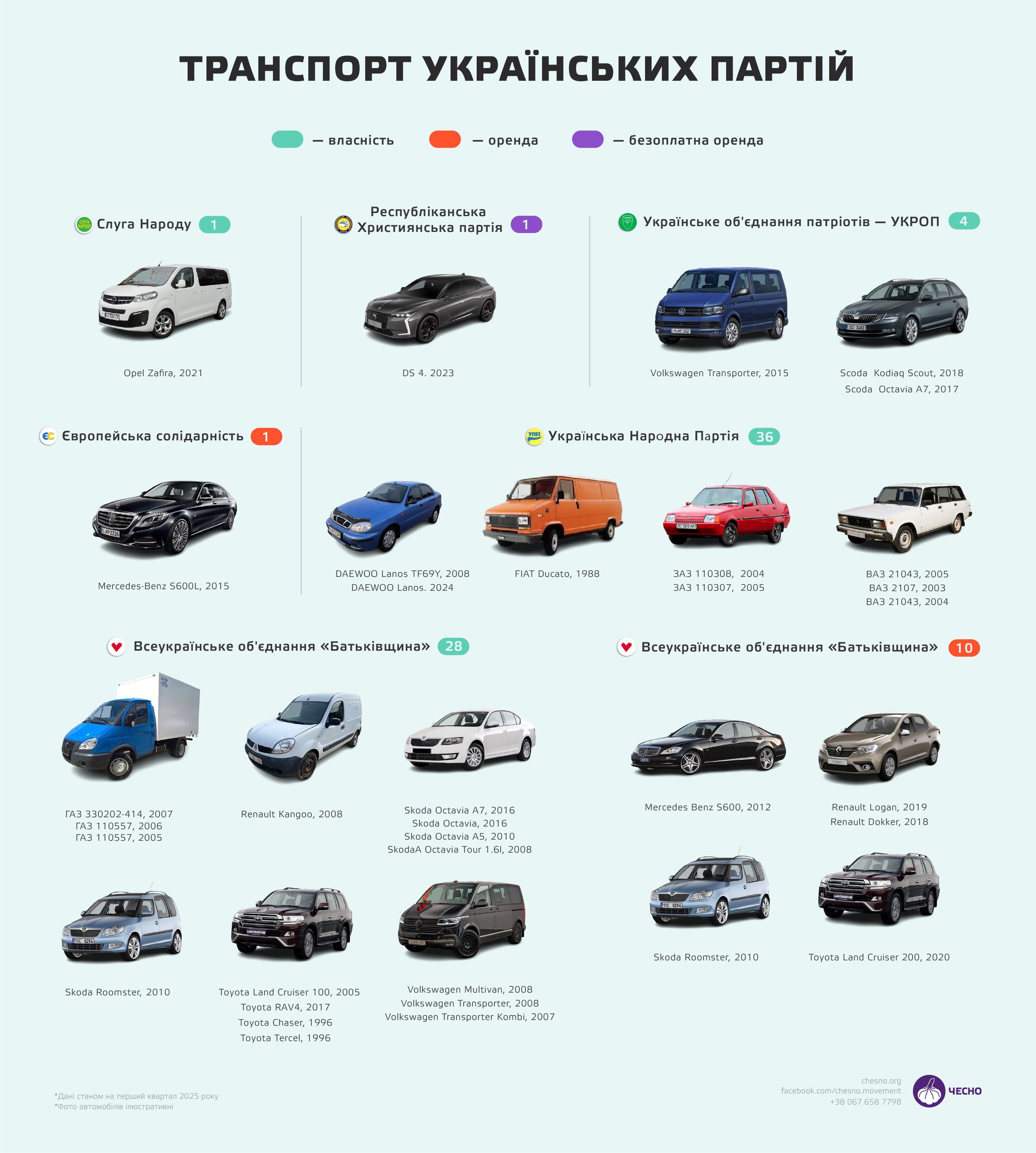 У звітах за перший квартал 2025 року лише шість політичних партій вказали наявність транспорту. З них чотири мають автомобілі у власності, а ще дві користуються ними на умовах оренди чи безоплатно. Про це йдеться в аналізі ЧЕСНО.