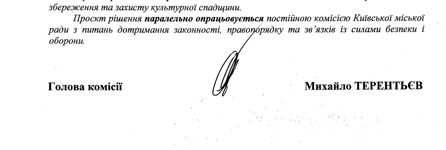 І ось напередодні чергової сесії столичної ради на сайті з’явився порядок денний земельної комісії, підписаний самим Михайлом Терентьєвим. Як відомо, раніше депутат отримав підозру, вийшов під заставу та був виключений із фракції УДАР. Також на з’їзді партії в травні прийняли рішення позбавити Терентьєва депутатського мандату, яке він пізніше оскаржив у суді.