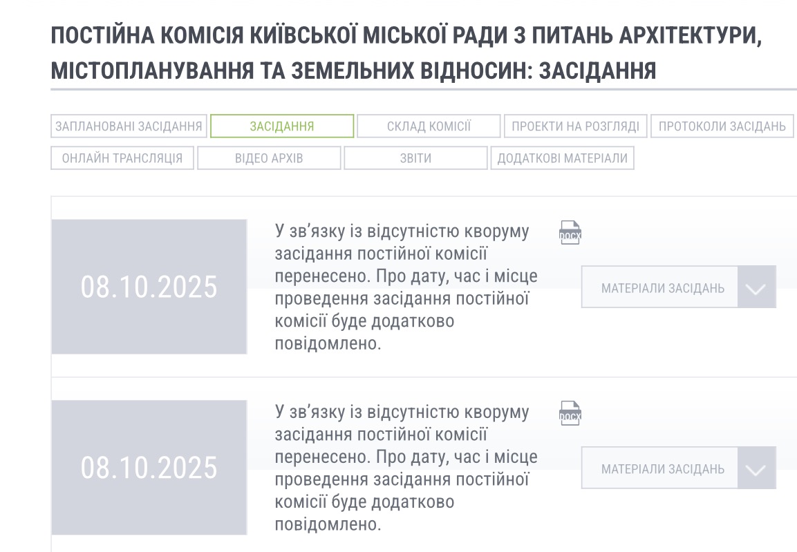 Проте Михайло Терентьєв та більшість членів комісії так і не з’явилися. Зазначимо, земельна комісія — одна з найбільших у Київраді. До її складу входять 26 столичних обранців і 42% з них обіймають керівні посади. Йдеться про трьох перших заступників і шістьох заступників голови — на додачу до голови та секретаря.