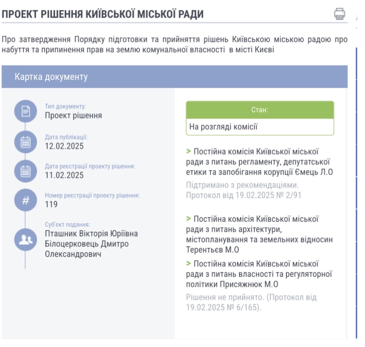 Кілька місяців тому Київрада ухвалила в першому читанні антикорупційний земельний порядок. Тоді проєкт “Про затвердження Порядку підготовки та прийняття рішень Київською міською радою про набуття та припинення прав на землю комунальної власності в місті Києві” відправили на доопрацювання, і фракції мали змогу подавати свої пропозиції.