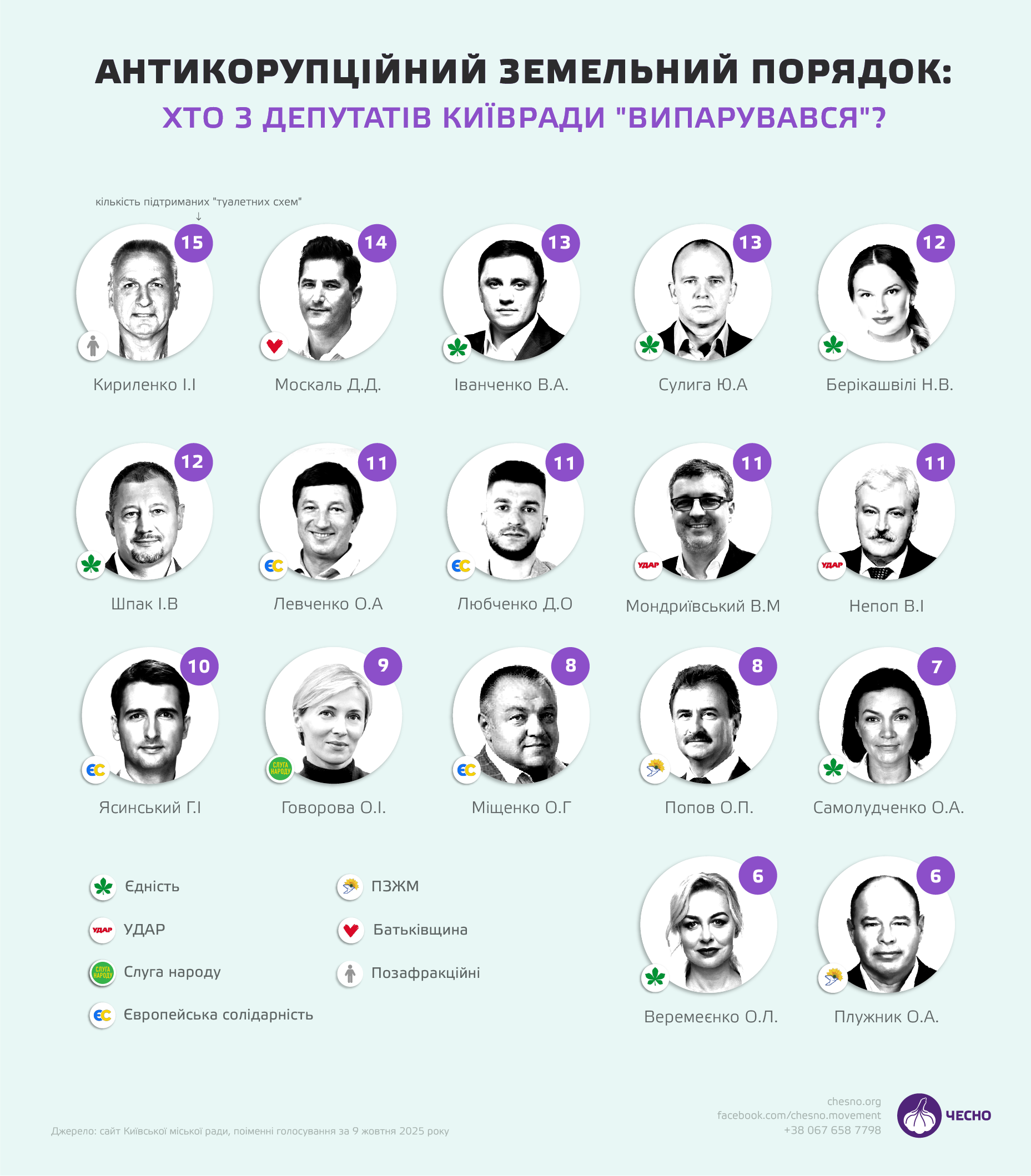 Зазначимо, що Кириленко є й лідером за рівнем підтримки “туалетних схем”. Співголова фракції “Батьківщина” та голова екологічної комісії Денис Москаль, підтримавши 14 корупційних проєктів, брав участь у голосуваннях одразу після ухвалення земельної ініціативи вже за кілька хвилин після того. Нещодавно ЧЕСНО писав, що депутат фігурує в скандалі зі столичною забудовницею та засновницею Stolitsa Group Владиславою Молчановою.