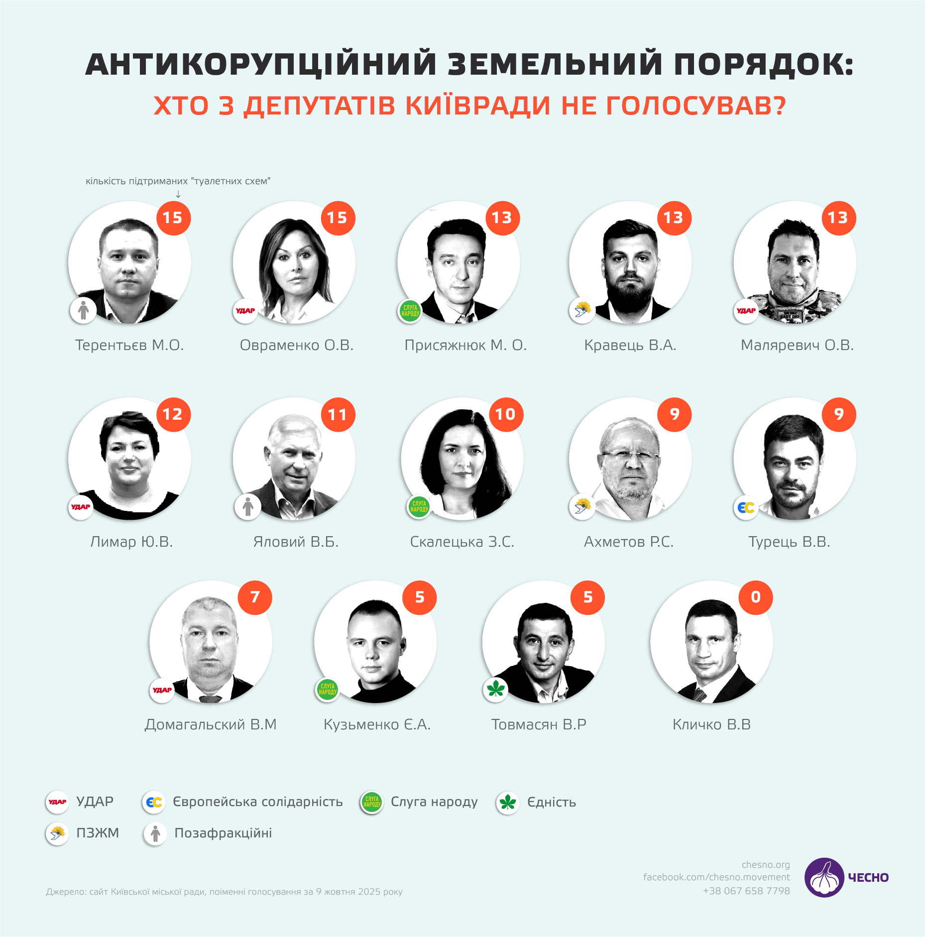 У переліку тих, хто “не голосував”, значаться лідери за кількістю голосувань за так звані “туалетні схеми”, зокрема Михайло Терентьєв та Олена Овраменко. Нагадаємо, що йдеться про 15 скандальних земельних проєктів, про скасування котрих пізніше Київрада зареєструвала ініціативи.