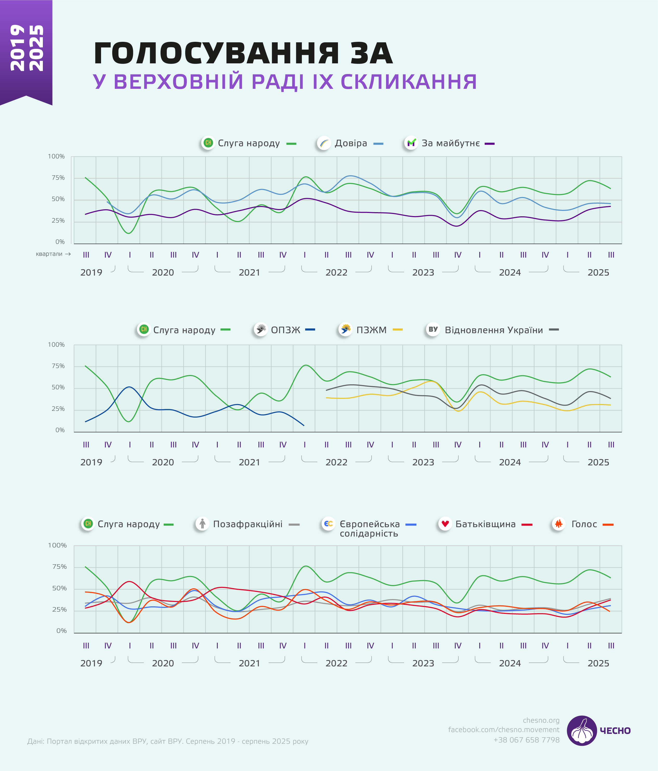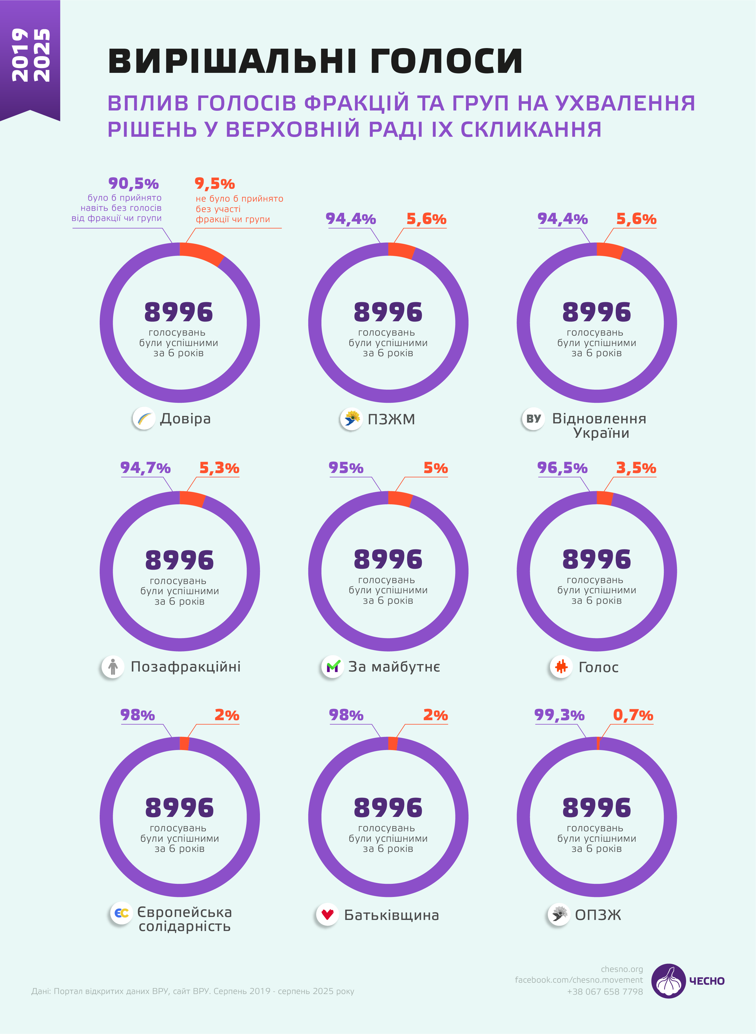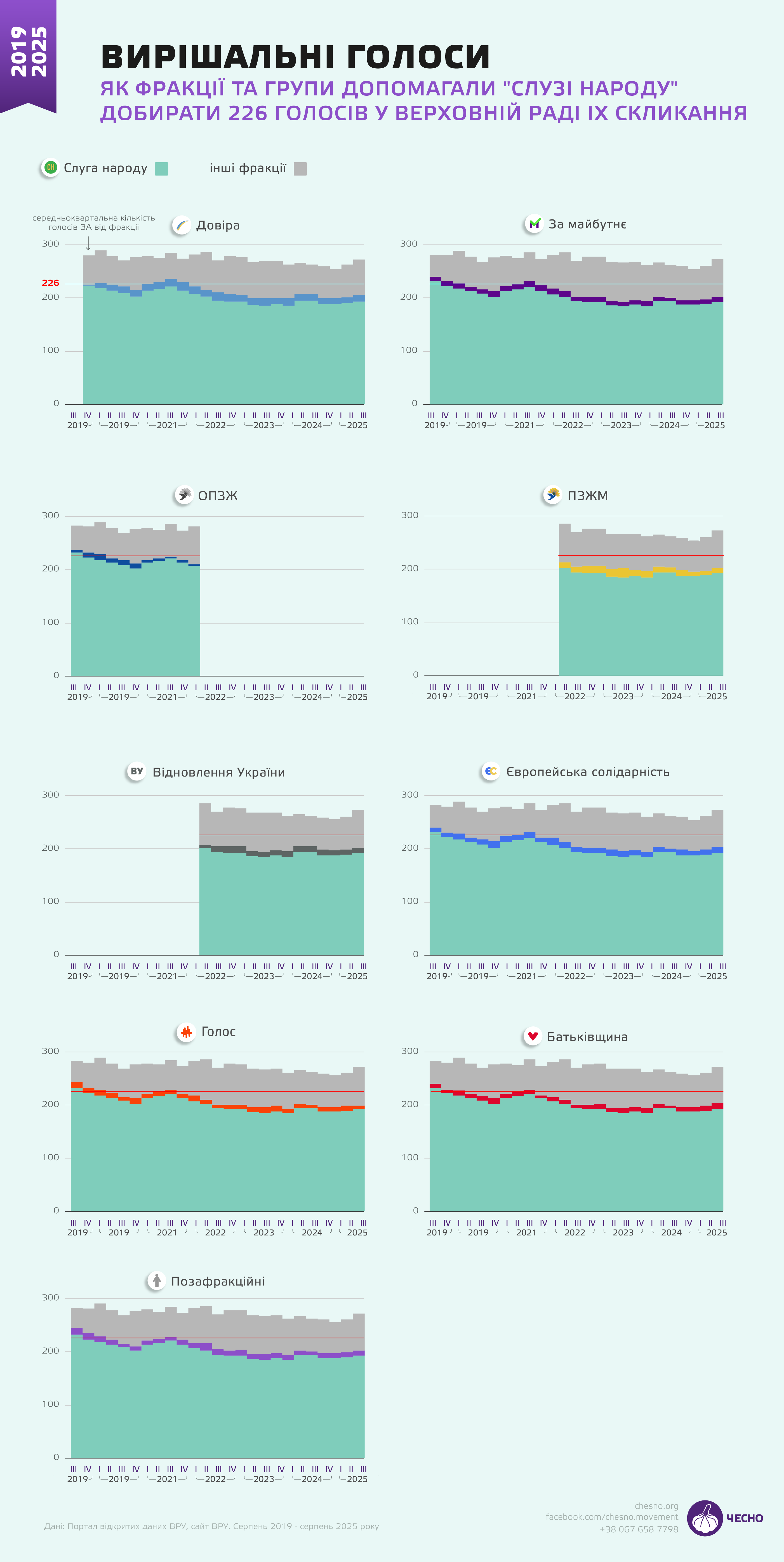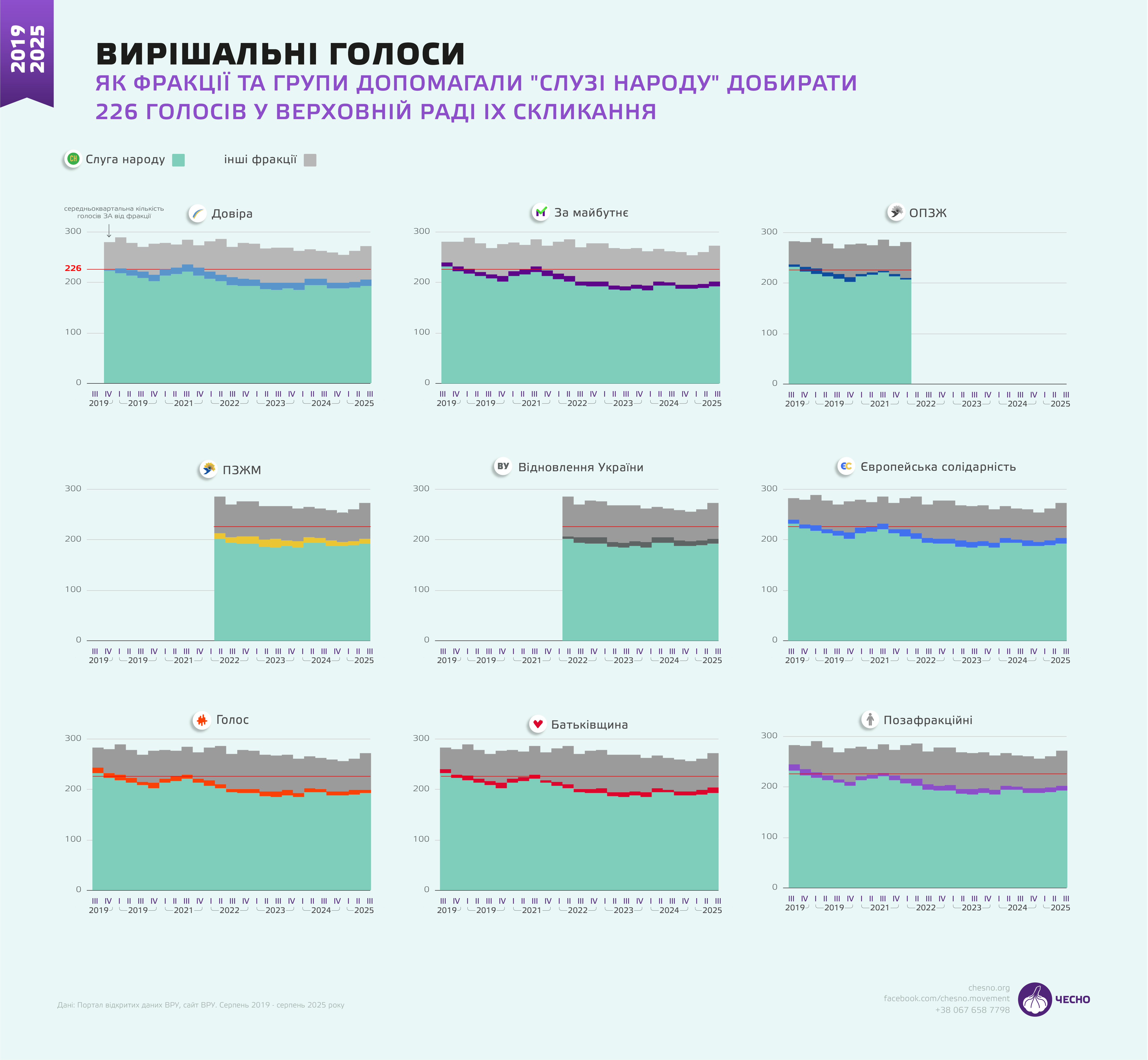 ЧЕСНО проаналізував голосування Верховної Ради за шість років — з 2019-го і до серпня цього року, — щоб визначити, хто допомагає монобільшості і від кого найбільше залежить успіх голосувань у парламенті.