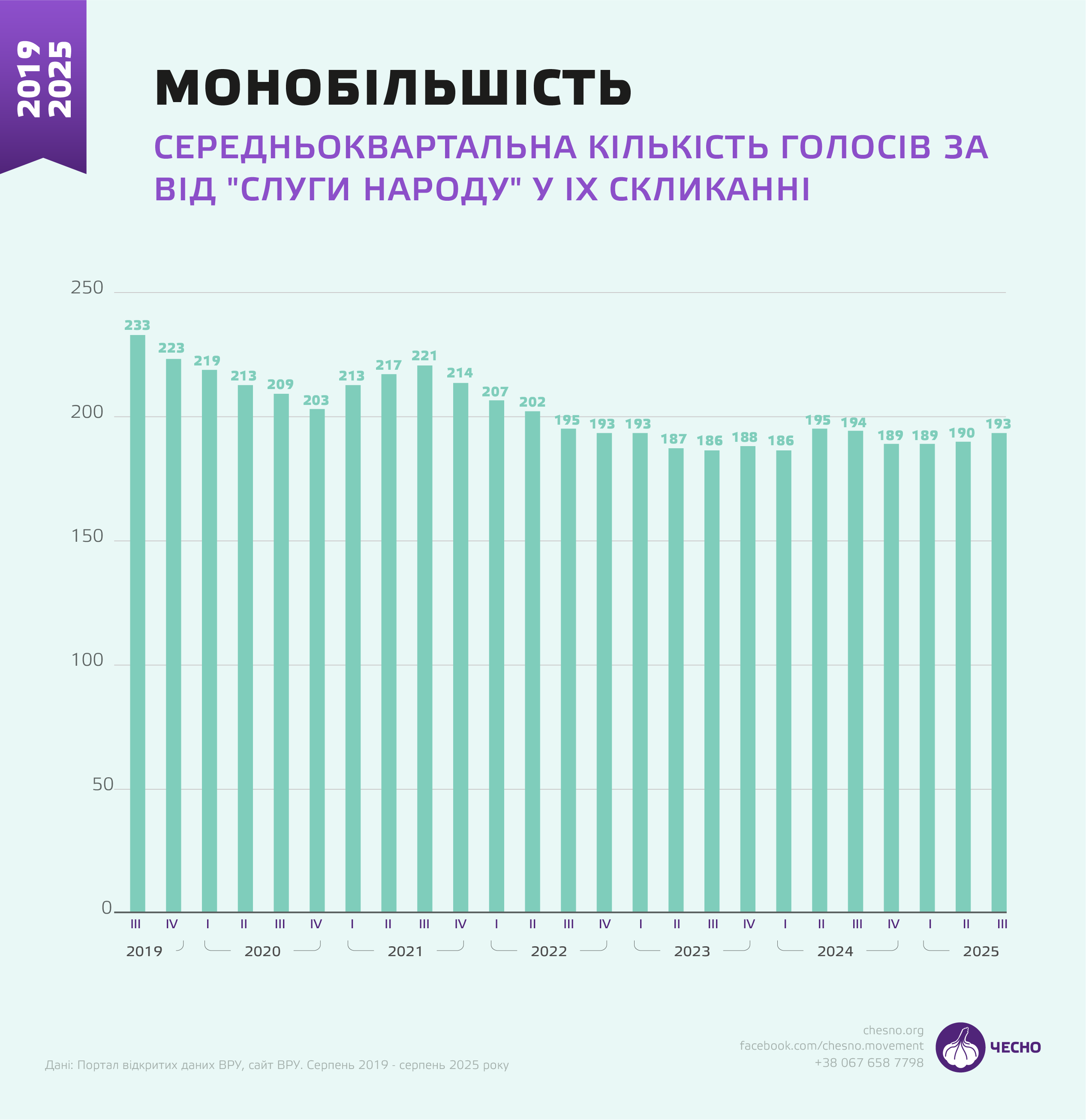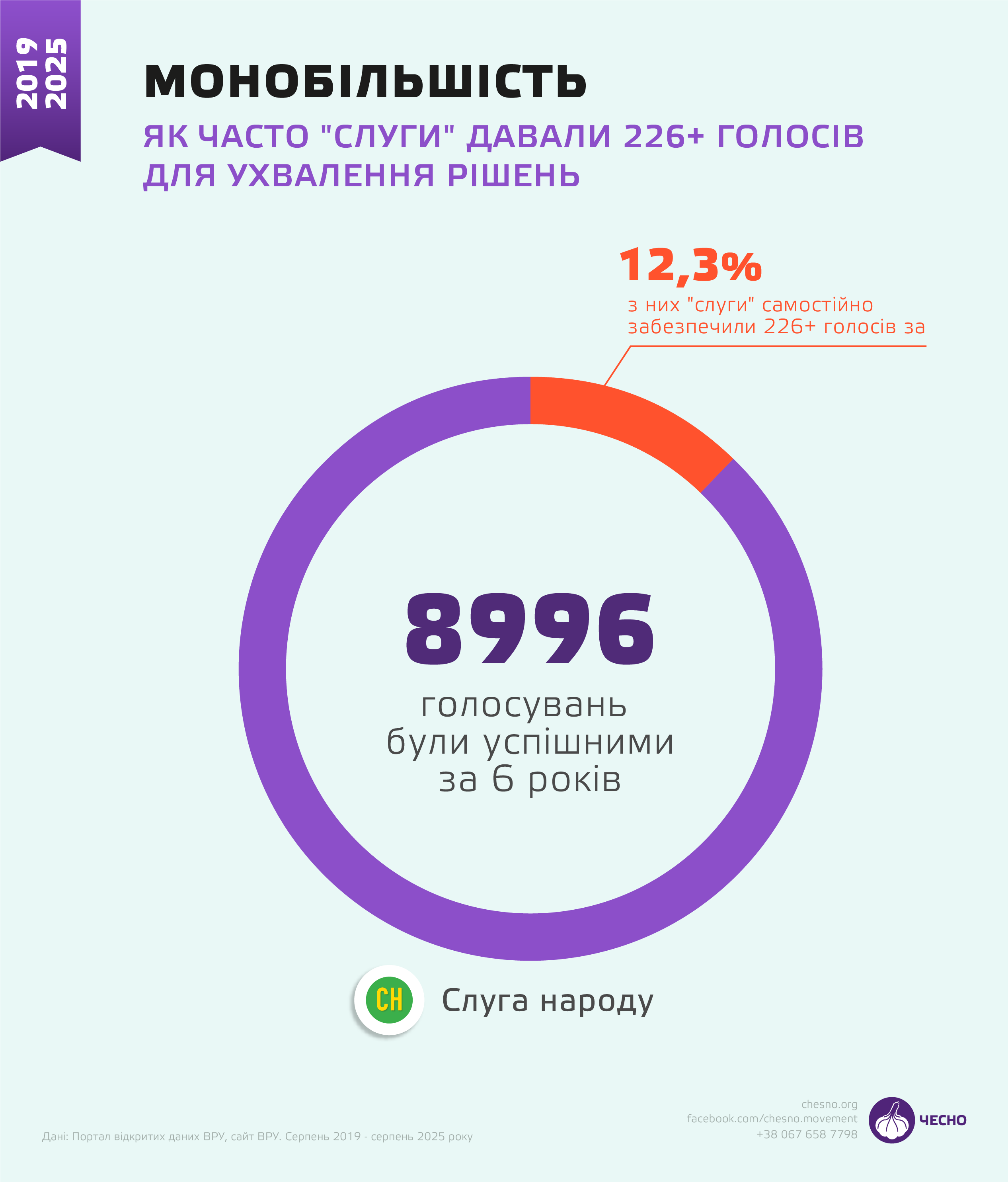 Загалом за шість років “Слуга народу” спромоглася самостійно дати мінімальні 226 і більше “за” лише під час 1100 голосувань з майже 9000 усіх успішних голосувань (тобто лише в 12%). У решті випадків їм доводилось дозбирувати голоси до необхідних для ухвалення рішення 226-ти серед інших депутатських фракцій та груп.
