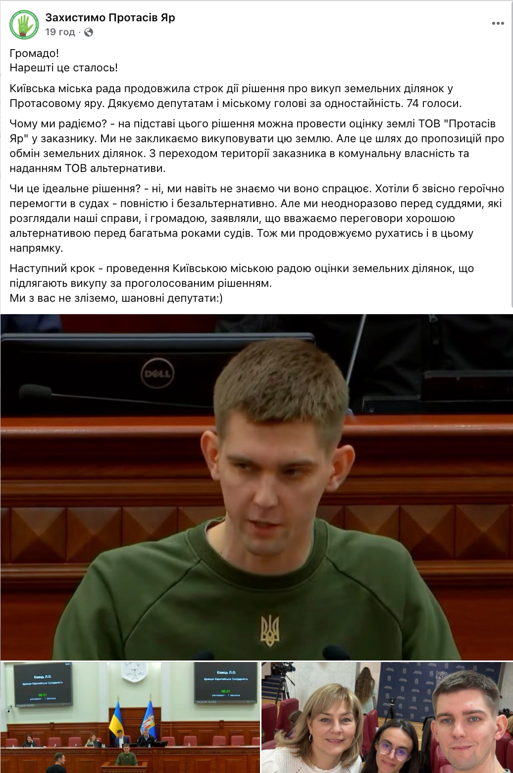 На засіданні виступив представник ГО “Захистимо Протасів Яр” Антон Дикань: “Ми чудово розуміємо, що викуп неможливий під час воєнного стану, але це дозволить робити перші адекватні кроки в сторону оцінки землі. Тепер ми просимо продовжити це, щоб бути послідовними та дотримуватись своїх же наданих обіцянок”.