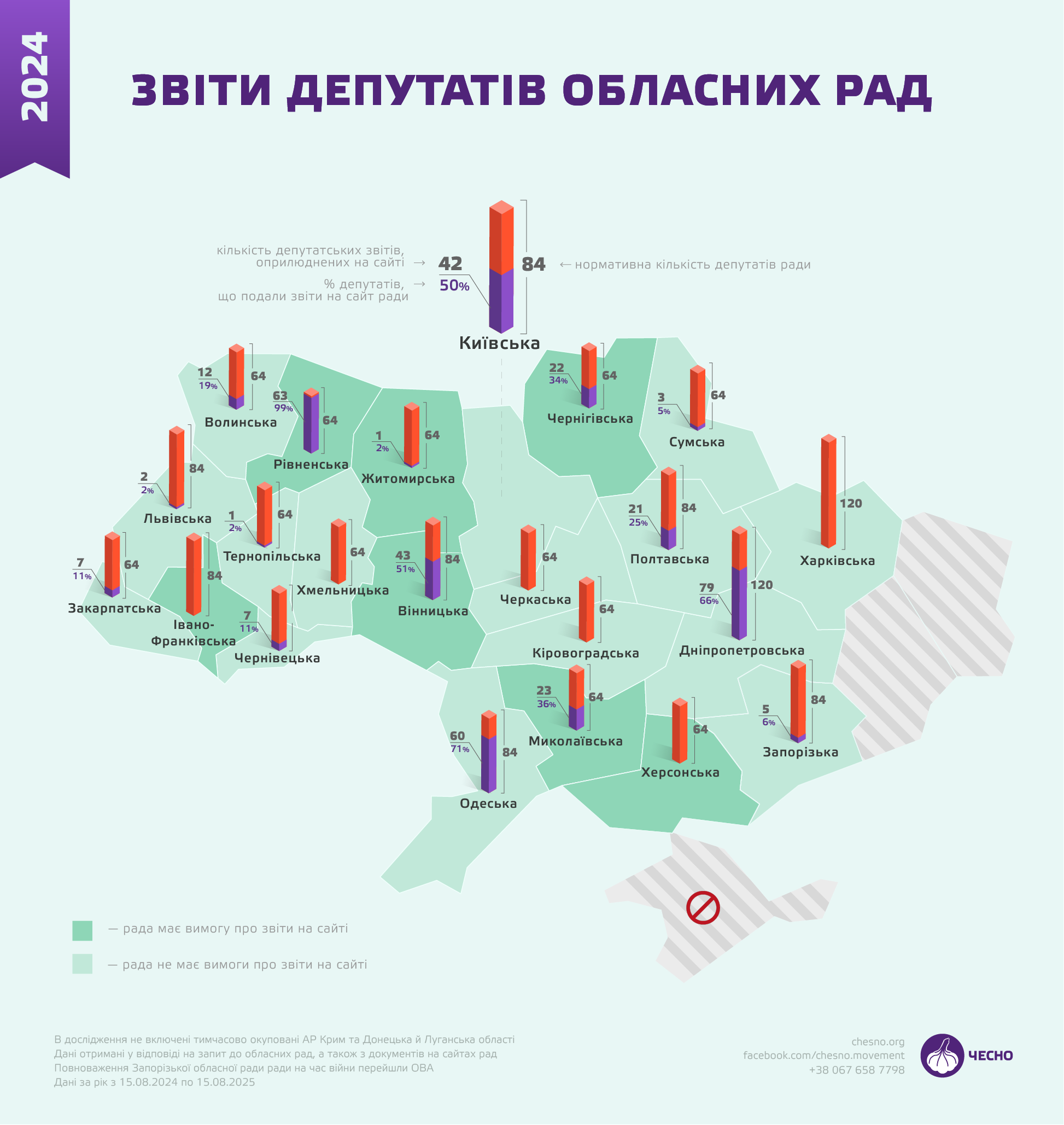 Лише 24% від загальної кількості депутатів обласних рад країни відзвітували перед виборцями на сайтах своїх рад про роботу в 2024-му. Найбільше — обранці Рівненщини (99%), Одещини (71%) та Дніпропетровщини (66%). Вісім рад оприлюднили від одного до 12 звітів депутатів. Жодного оприлюдненого письмового звіту на своїх порталах не мають аж шість рад: Івано-Франківська, Кіровоградська, Харківська, Херсонська, Хмельницька та Черкаська. Про це йдеться в аналізі ЧЕСНО.