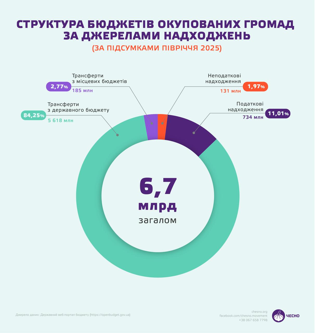 Рух ЧЕСНО дослідив, як формуються та розподіляються бюджети окупованих громад. Дані отримані у відповідь на запити до військових адміністрацій та з державного порталу бюджету для громадян за перше півріччя 2025 року. Дослідження охоплює дані 115 громад, які були повністю окуповані станом на 28 лютого 2025 року.