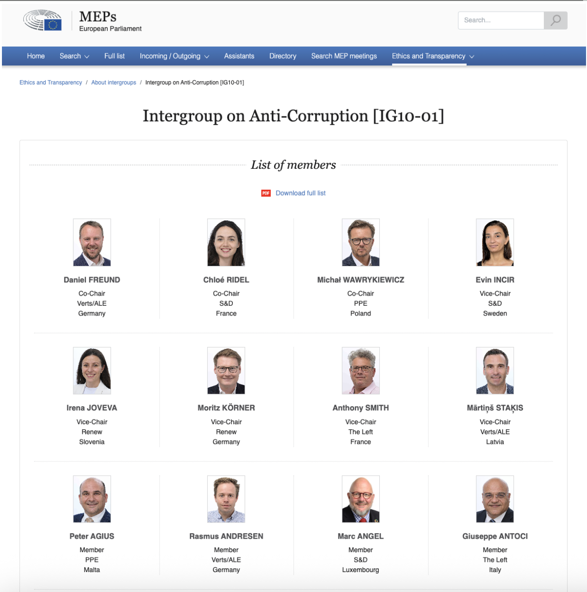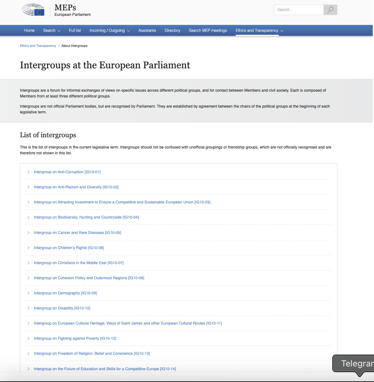 У Європейському парламенті міжгрупи не є офіційними органами парламенту, але визнаються ним і створюються за згодою голів політичних груп на початку кожної легіслатури. Інформація про них теж є у відкритому доступі.