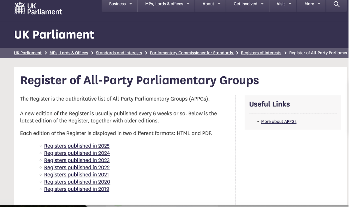 У багатьох країнах такі дані є відкритими, і це норма, а не виняток. Наприклад, у Великій Британії існує офіційний Реєстр міжпартійних парламентських груп, де публікуються відомості про доходи та витрати цих об'єднань, протоколи формальних зустрічей та політичні брифінги.