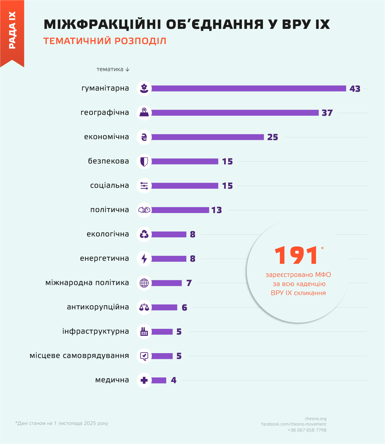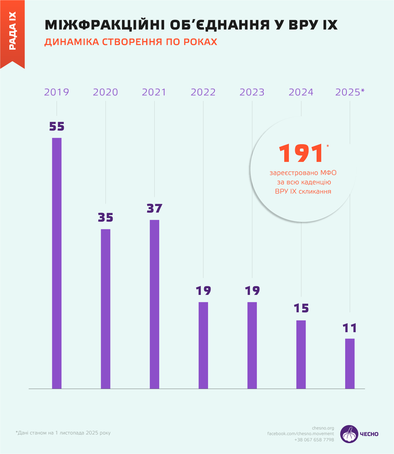 У Верховній Раді ІХ скликання станом на початок листопада 2025 року зареєстрували 191 МФО, чотири з яких уже припинили свою діяльність — тобто майже у кожного депутата є хоча б одна “неформальна” парламентська приналежність.