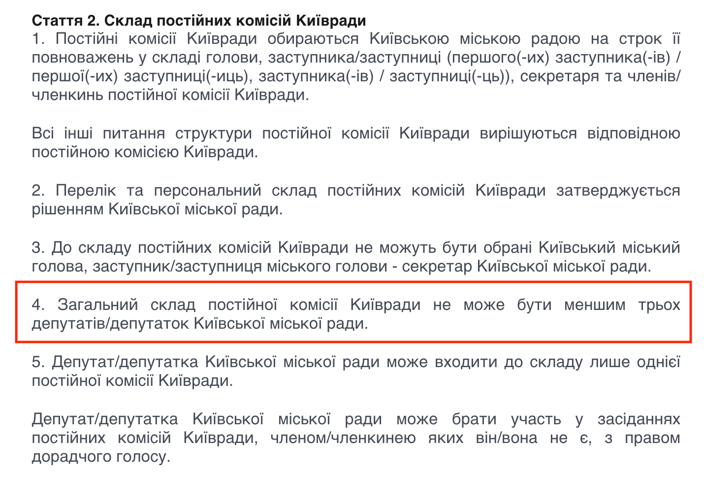 ЧЕСНО аналізував роботу комісій Київради та описав ситуацію, у якій сьогодні перебуває комісія з питань дотримання законності. Сьогодні там усього двоє членів — голова Ігор Опадчий з фракції УДАР та Олександр Плужник із групи ПЗЖМ. Чинне положення передбачає, що кількість членів має складати щонайменше три.