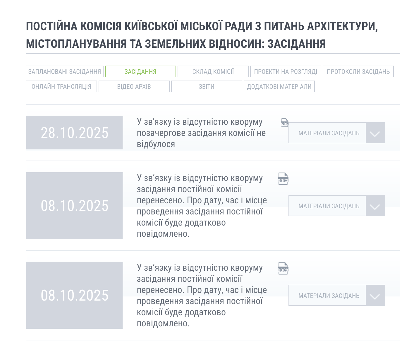 Провести позачергове засідання комісія намагалася ще 28 жовтня, проте вже не з ініціативи Михайла Терентьєва. Положення про постійні комісії Київради передбачає, що можливо зібратися “на письмову вимогу не менше однієї третини членів” — та, попри зібрані підписи, кворуму так і не було.
