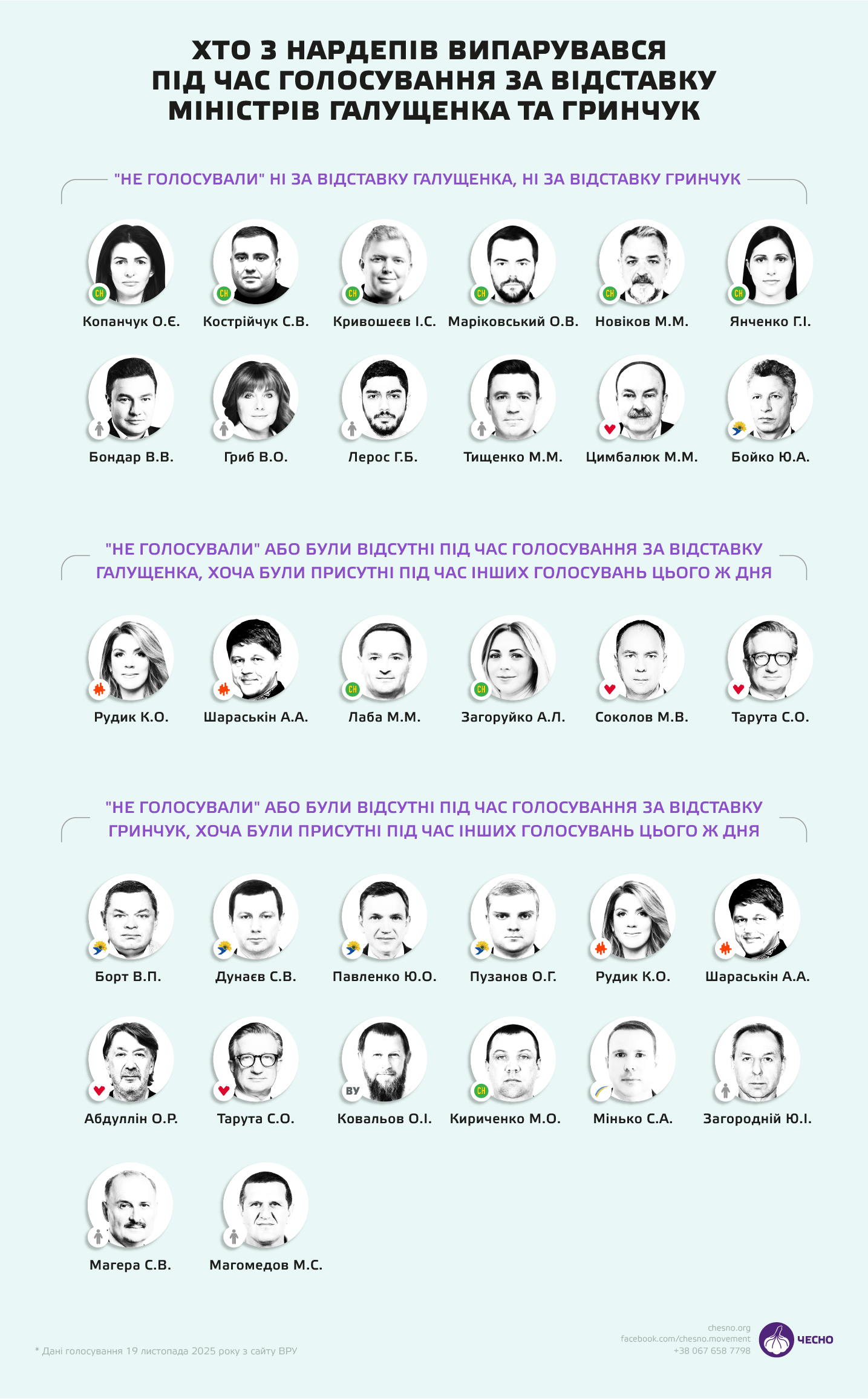 Хоча жоден депутат не натис червону (проти) чи жовту (утриматися) кнопки, окремі народні обранці ухилились від участі в голосуванні. Так 15 депутатів не натисли жодної кнопки під час звільнення Галущенка (на табло така дія відображається як “не голосував”), хоча були присутні в залі, а 21 депутат зробив те саме під час голосування щодо Гринчук.