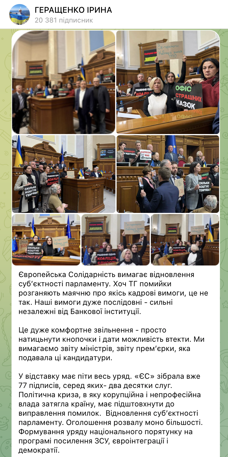 Нагадаємо, раніше “Євросолідарність” та “Голос” виступили з вимогою відставки уряду Свириденко і формування нової проукраїнської більшості в парламенті та нового уряду. “ЄС” розпочала збір підписів за звільнення всього уряду, і станом на 19 листопада вдалося зібратися 51 підпис, зокрема і від окремих депутатів “Слуги народу”. Водночас лідерка “Батьківщини” Юлія Тимошенко оголосила, що також ініціює збір підписів за відставку Кабміну.