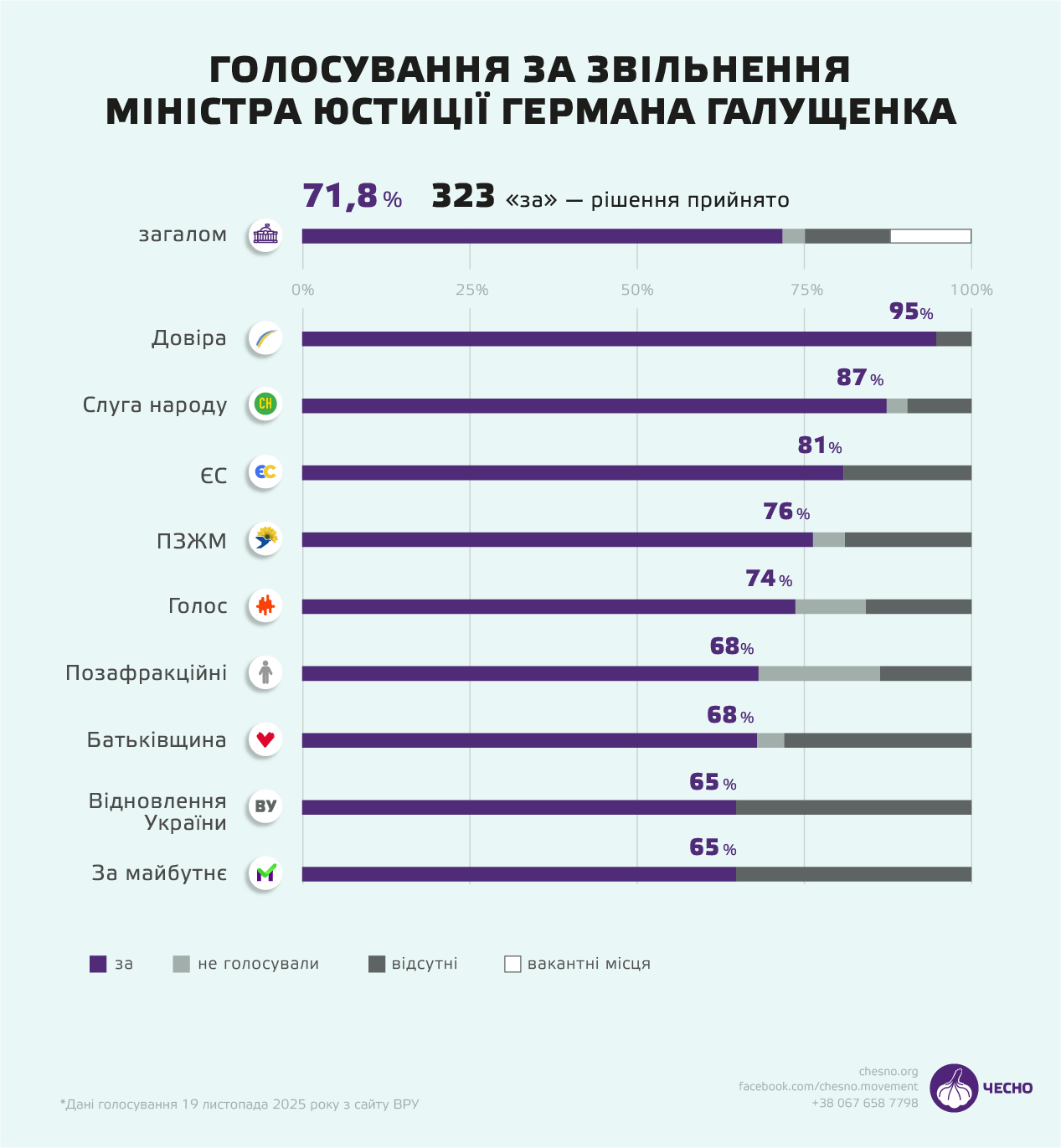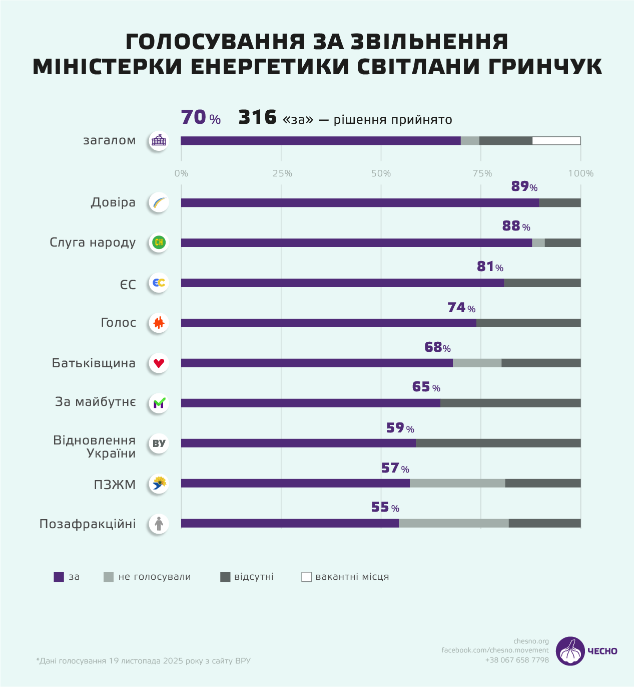 Показово, що серед проросійських депутатів у відсотковому співвідношенні підтримка звільнення замішаних в корупційному скандалі міністрів була дещо нижчою, ніж в інших фракціях і групах. Також не настільки одностайною була позиція всередині “Батьківщини” та “За майбутнє”. Водночас серед членів “Слуги народу”, “Євросолідарності” та “Довіри” понад 80% голосували за.