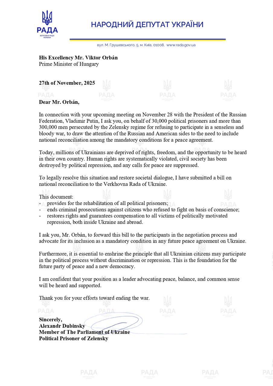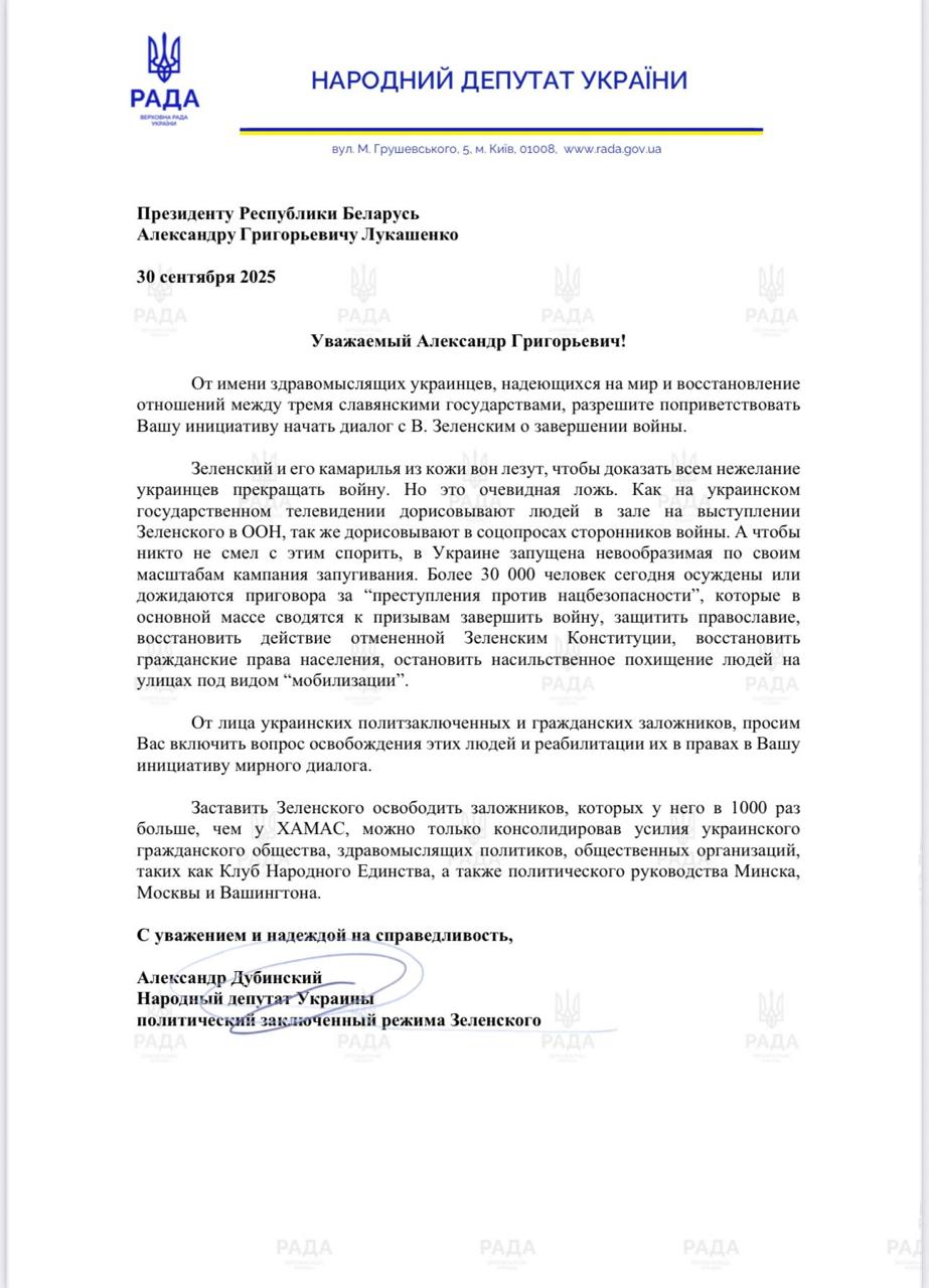 А втім, Дубінський не лише створює МФО в СІЗО. Він також відправляв депутатські звернення, а ще писав на бланку нардепа листи світовим політикам, зокрема угорському премʼєру Віктору Орбану й білоруському диктатору Олександру Лукашенку, а ще колегам-депутатам.
