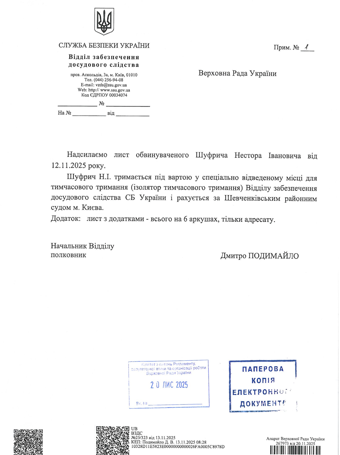 Як видно з листа регламентного комітету голові Верховної Ради, алгоритм депутатської роботи Шуфрича із СІЗО такий: свої законопроєкти він передає у паперовому вигляді разом із флешкою, де є електронні копії цих документів. Усе це разом із супровідним листом до Верховної Ради надсилає начальник відділу досудового забезпечення слідства СБУ, відповідальний за утримання Шуфрича в ізоляторі.