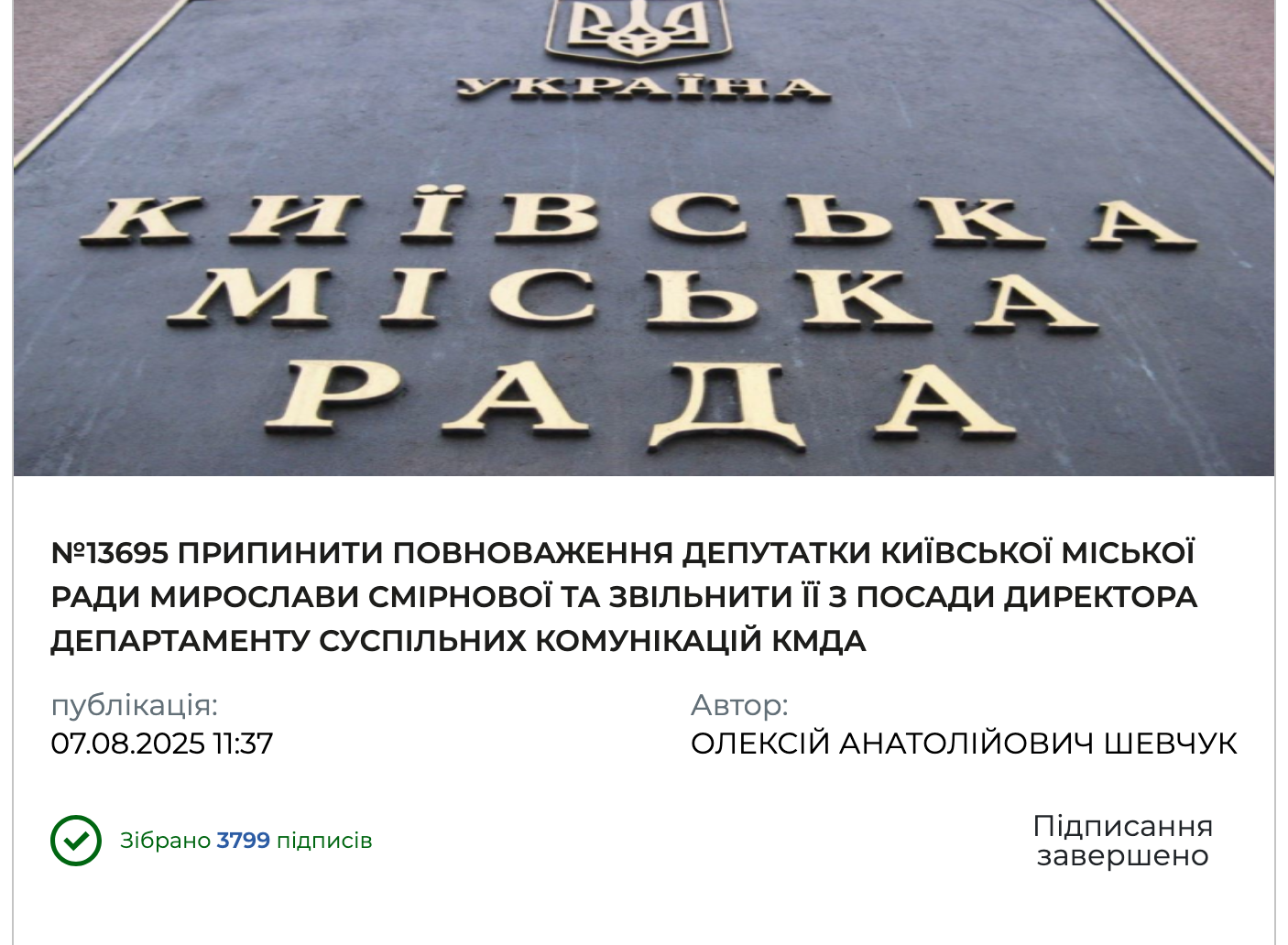 Нагадаємо, що у серпні з’явилася петиція, яка вимагала припинити повноваження Мирослави Смірнової та звільнити її з посади директорки департаменту суспільних комунікацій КМДА. Основна причина — її участь у святкуванні дня народження у День жалоби 1 серпня після російської атаки на Київ. Тоді петиція набрала 3799 підписів.