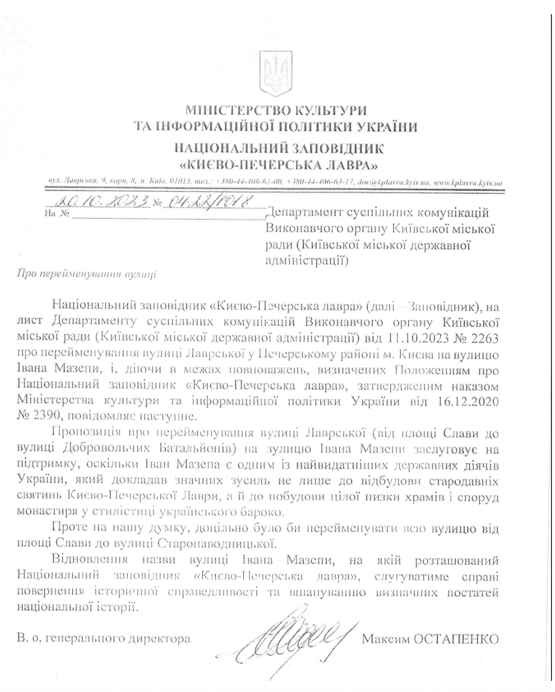 Тож повернення до старої назви “послужить справі відновлення історичної справедливості”, як зазначив у листі національний заповідник “Києво-Печерська Лавра”. Додамо, що Лавра підтримувала перейменування усієї вулиці на честь Івана Мазепи, а не лише частини.