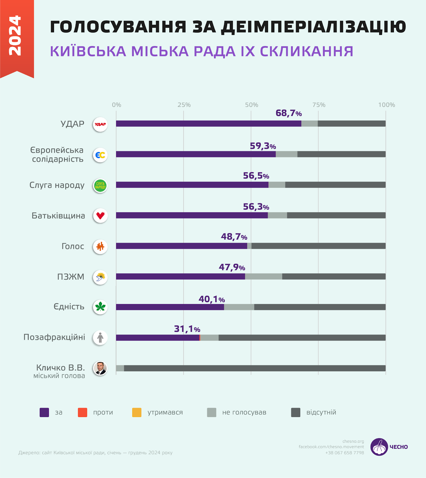 Процес деімперіалізації топонімів столиці Київрада розпочала ще у 2022 році. Раніше ЧЕСНО досліджував, як депутати голосували за проєкти перейменувань минулого року. Тоді ж член комісії з питань найменувань Тиміш Мартиненко-Кушлянський у коментарів ЧЕСНО зазначив, що у 2025 році очікувався ще один “раунд” голосувань за нові назви об’єктів міського підпорядкування.