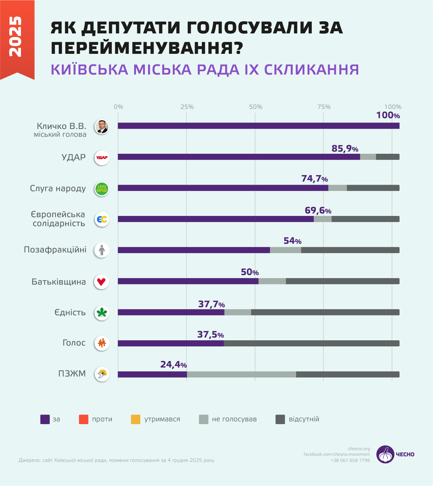 Детальніше про лідерів у підтримці дерусифікації, активізацію Віталія Кличка під час голосувань, майбутні перейменування та виклики зі вшануванням загиблих військових у топоніміці — у новому матеріалі ЧЕСНО.